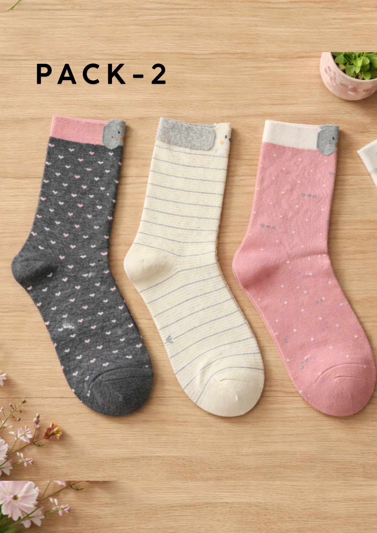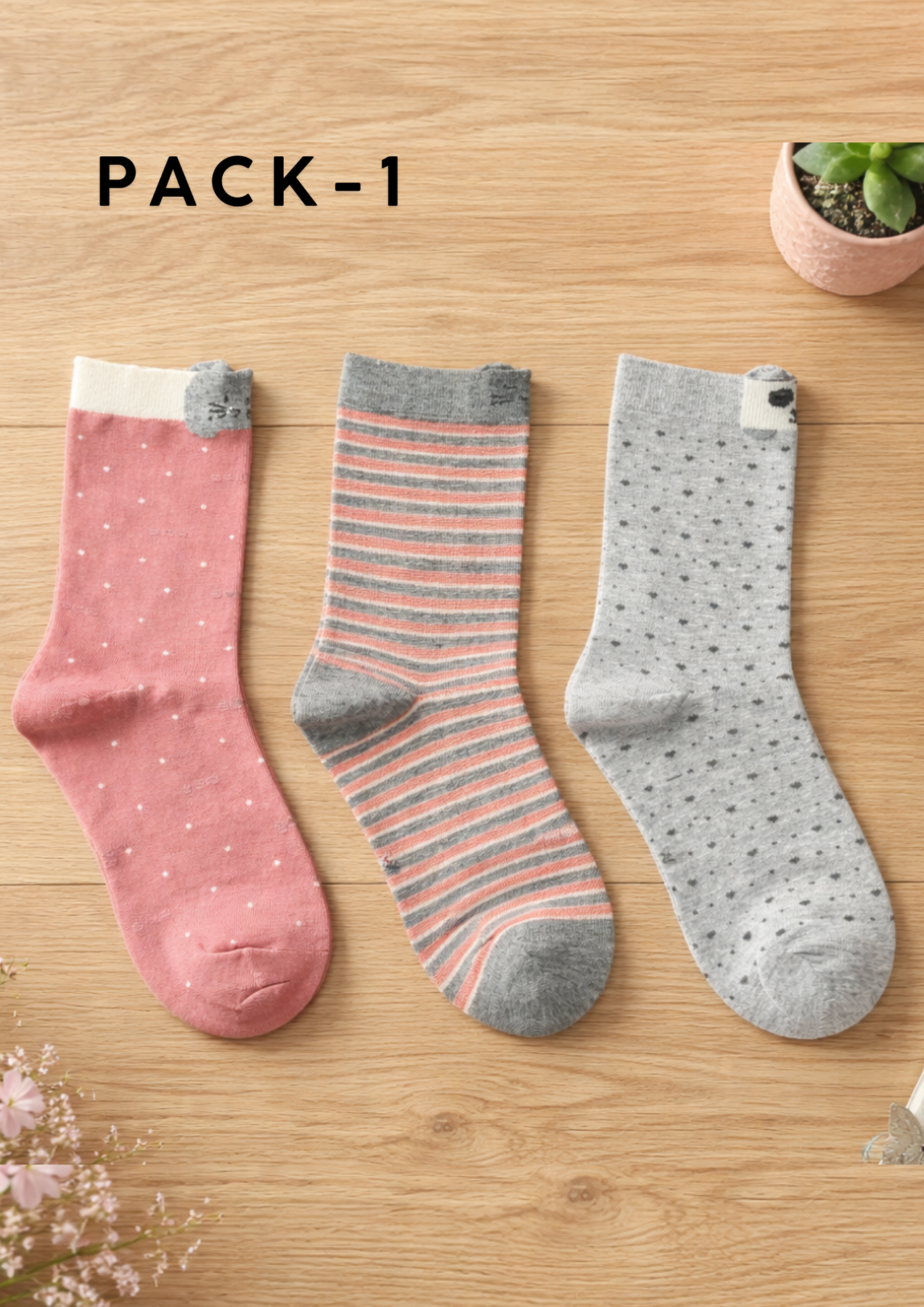 Descubre nuestro Pack de 3 Calcetines Estampados con diseños adorables que combinan comodidad y estilo. Cada par presenta patrones únicos y encantadores —desde delicados puntos hasta rayas coordinadas— perfectos para expresar tu personalidad en el día a día. Confeccionados con una suave mezcla de algodón transpirable, ofrecen la comodidad que mereces sin renunciar al toque de diversión. Ideal para completar cualquier look casual con ese detalle especial que marca la diferencia.