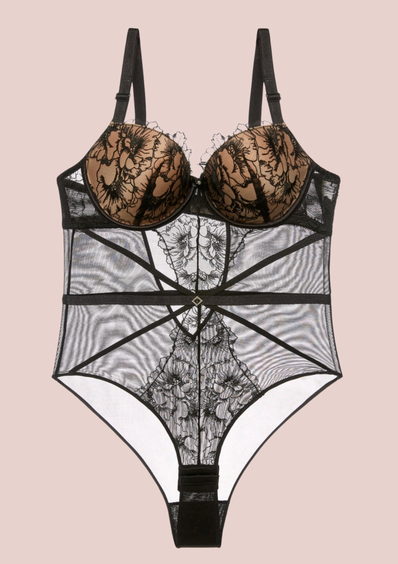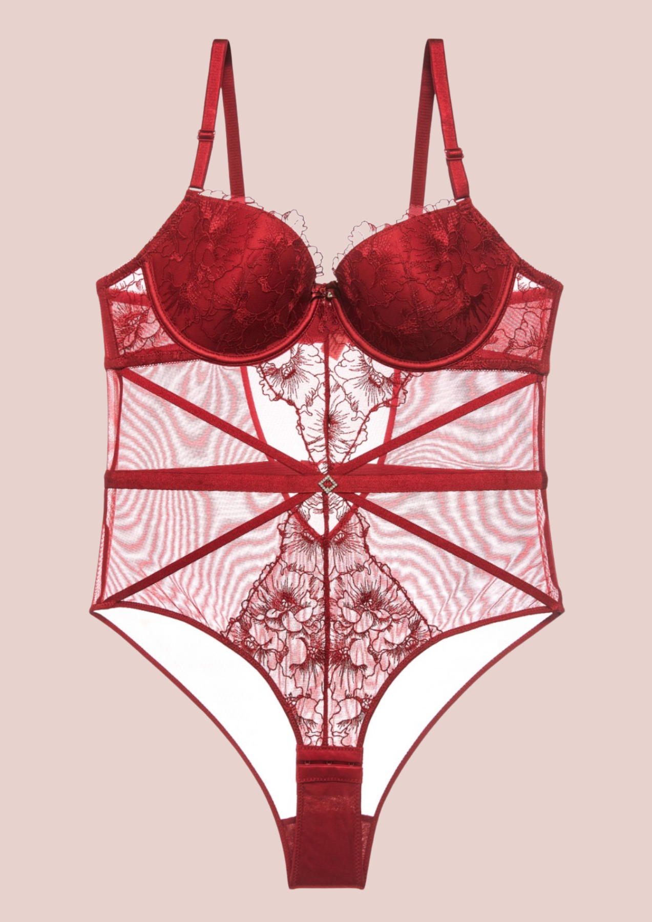 Body de lencería en negro y burdeos que combina encaje floral delicado con tul semitransparente para un look sofisticado y sensual. Las copas con aro realzan naturalmente el busto mientras los tirantes ajustables garantizan un ajuste personalizado y cómodo. Las líneas decorativas que recorren el torso crean una silueta favorecedora y estilizada. El tejido elástico se adapta perfectamente a tu cuerpo, ofreciendo la combinación perfecta entre elegancia, comodidad y feminidad. Un diseño romántico y refinado que te hará sentir segura y radiante.