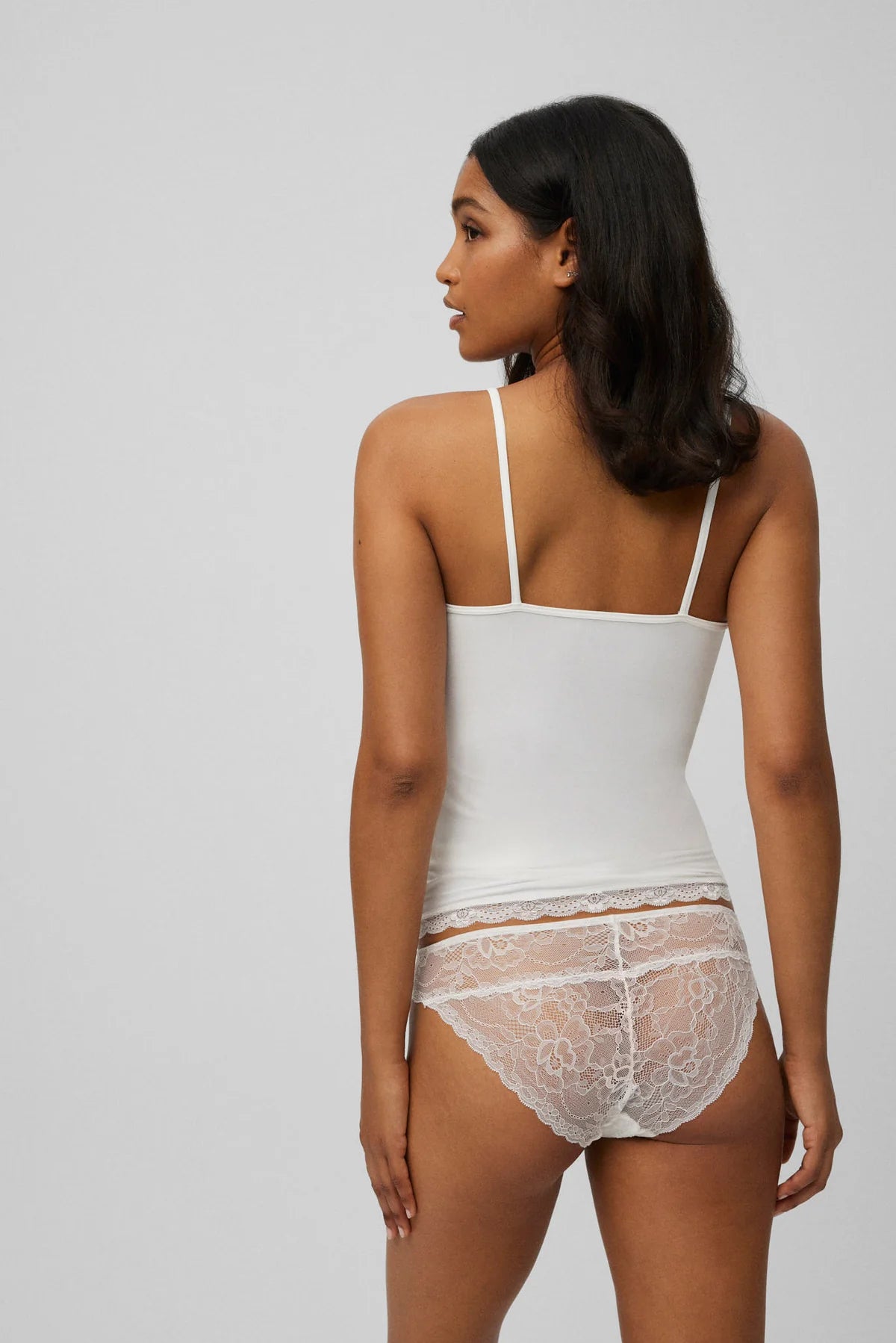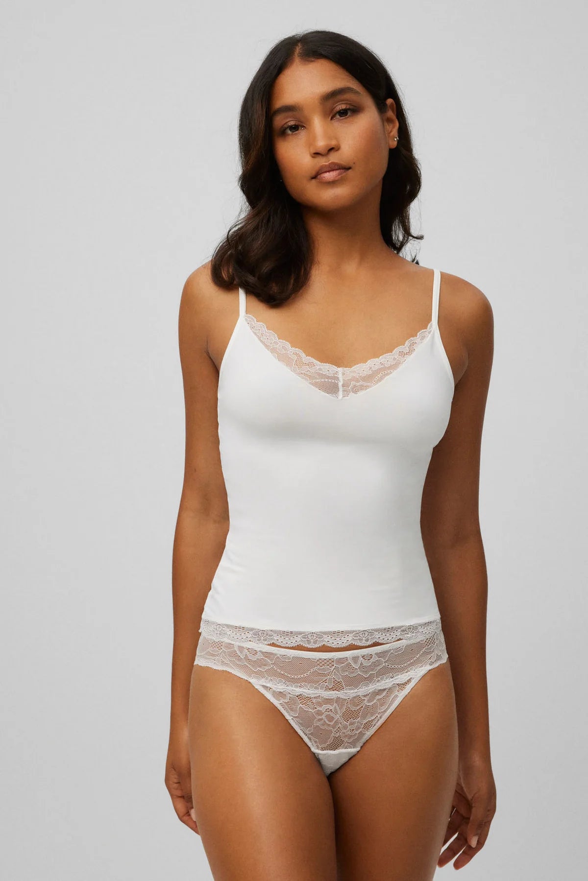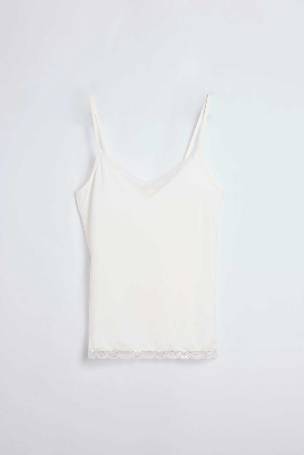 Camiseta de tirantes en marfil con encaje delicado que envuelve el escote, diseñada para combinar comodidad y feminidad. Su tejido ligero y elástico (90% poliamida, 10% elastano) se adapta al cuerpo con naturalidad, mientras que el remate en encaje aporta un acabado sofisticado. Versátil y seductora, úsala sola en días cálidos o bajo otras prendas para crear looks que van desde casual hasta elegante. Perfecta para el día a día.