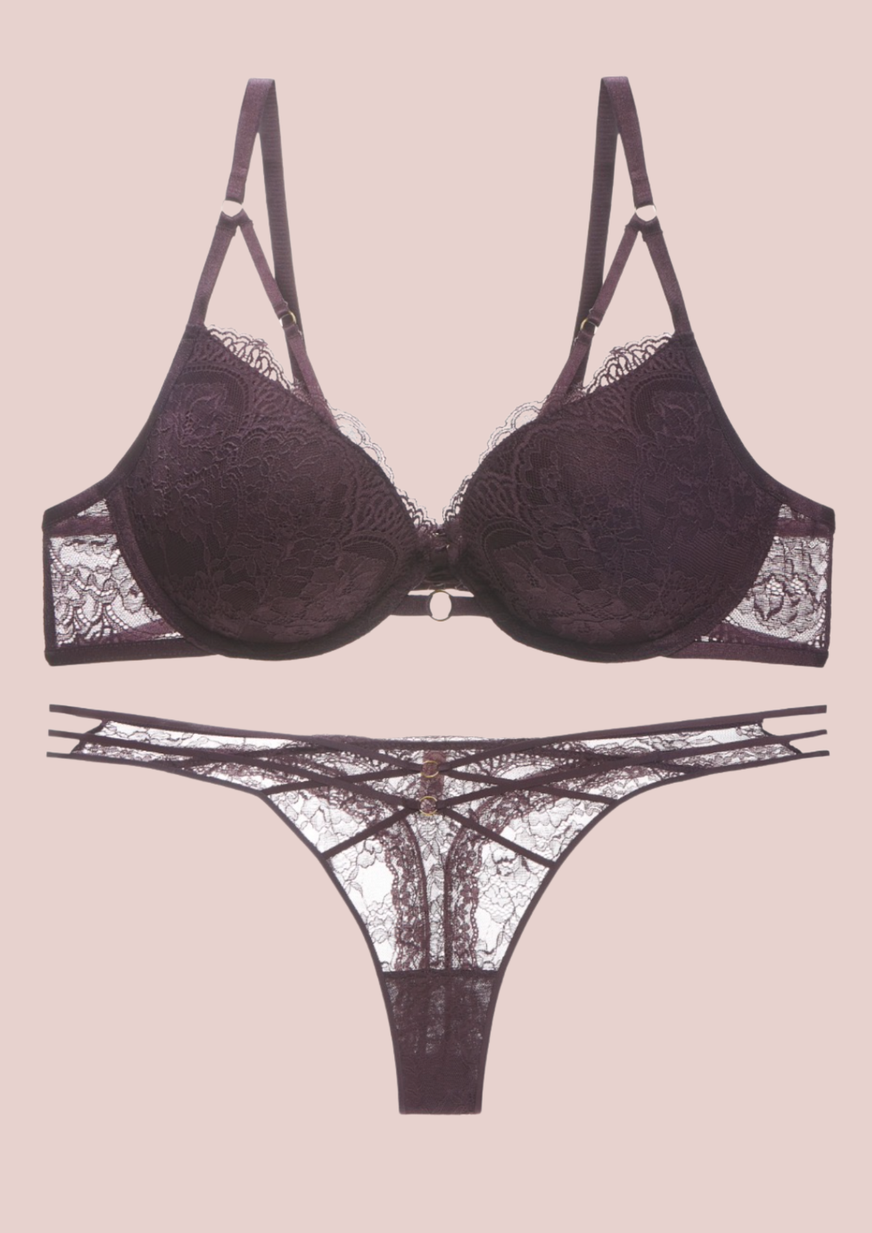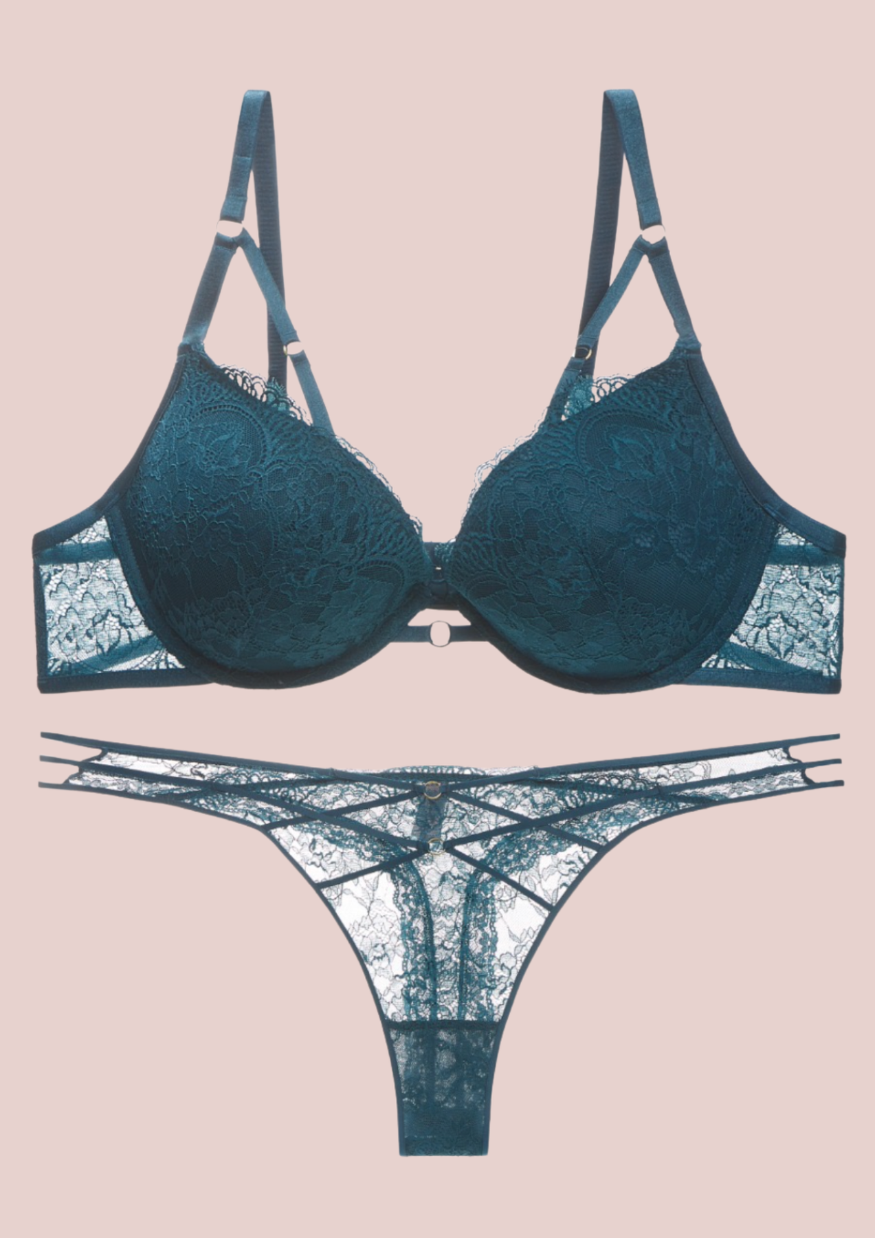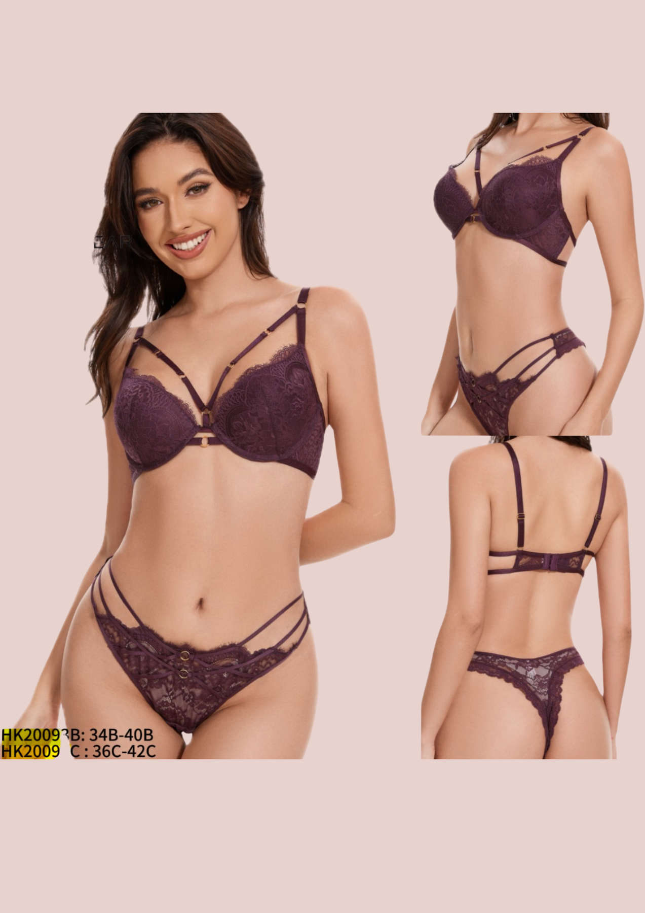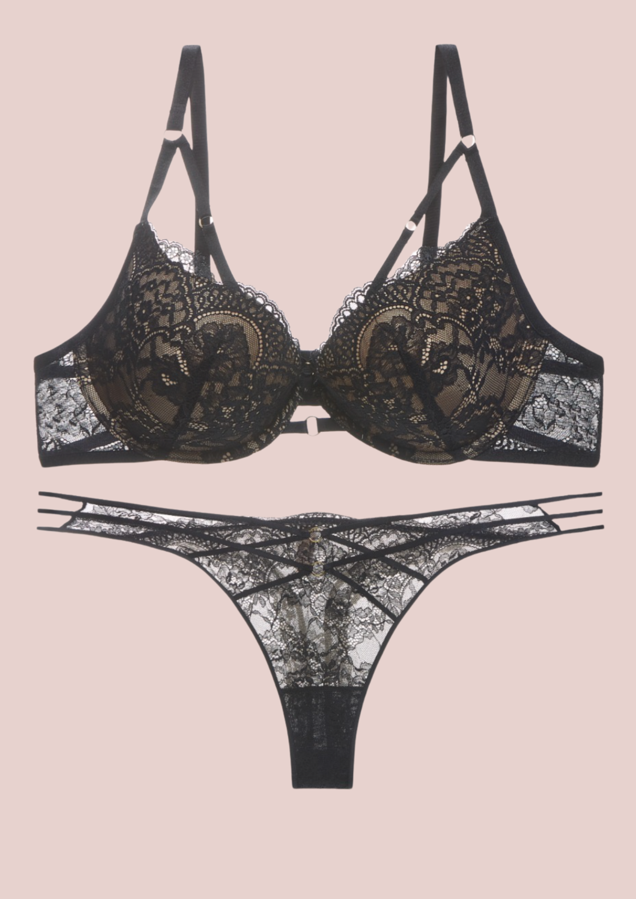Conjunto de lencería que captura la esencia de la sofisticación y el deseo. Combina encaje floral delicado con tejido semitransparente para crear un efecto sensual irresistible. El sujetador con aro copa-C realza y define tu busto con comodidad, mientras que los tirantes ajustables y las bandas decorativas bajo el pecho añaden un toque moderno y exclusivo que te diferencia. La braguita a juego presenta un panel frontal de encaje floral exquisito y laterales de tul suave que abrazan tu cuerpo sin restricciones. Su corte estratégico realza tu silueta de forma natural, logrando ese equilibrio perfecto entre sensualidad y libertad de movimiento. Perfecta para ocasiones especiales o para esos momentos en los que deseas sentirte absolutamente irresistible.