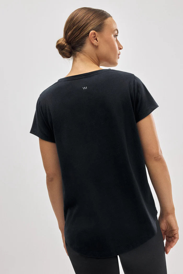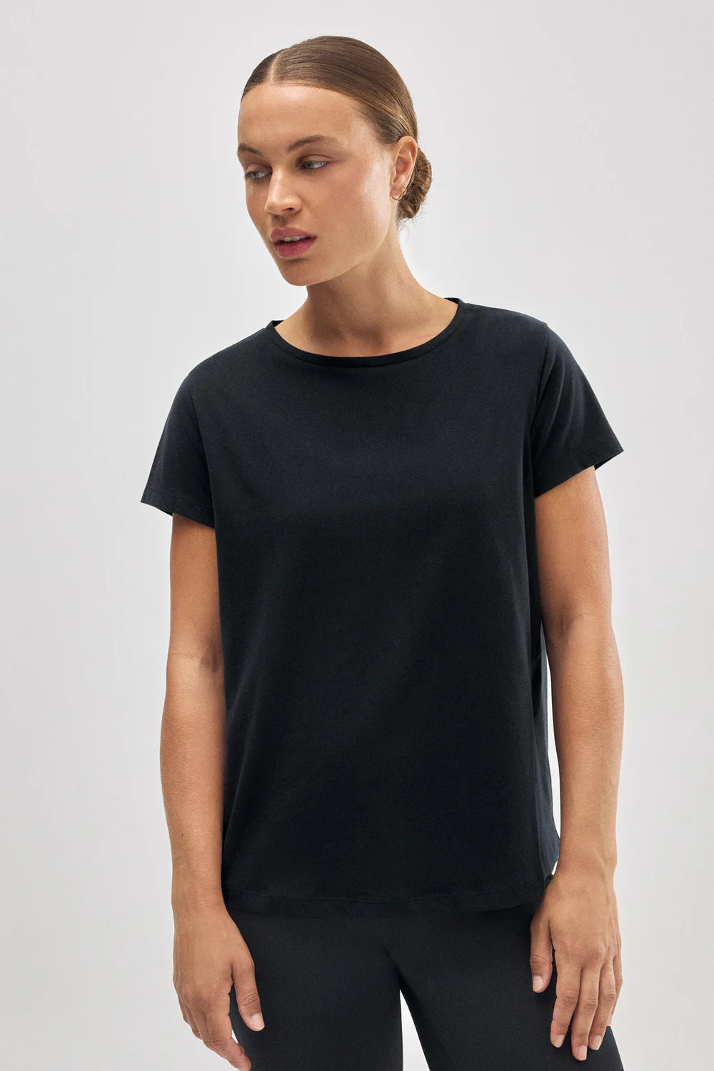 Esta camiseta deportiva negra combina estilo y función para acompañarte con comodidad durante tus entrenamientos suaves o en tu día a día. Fabricada 100% en algodón natural, ofrece un corte recto y relajado que facilita el movimiento sin restricciones. Su color negro, versátil y atemporal, la convierte en la prenda ideal para combinar con tus leggings favoritos, logrando un conjunto cómodo, elegante y funcional. Una elección imprescindible para quien busca libertad y estilo en cada paso.