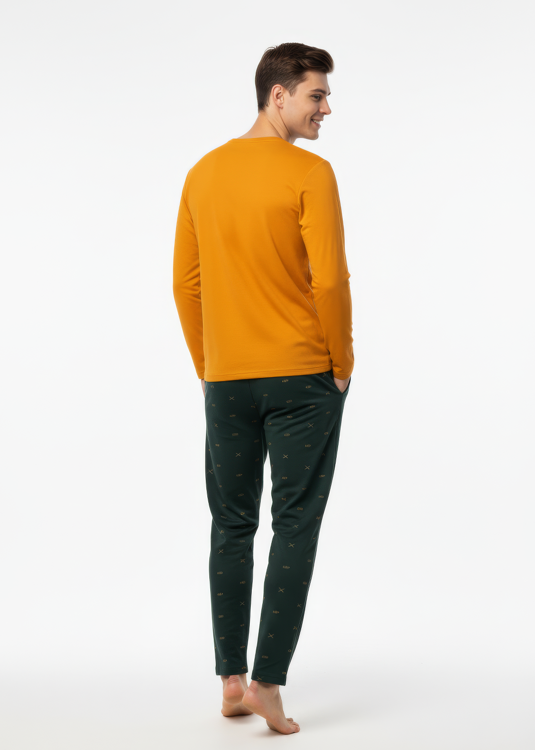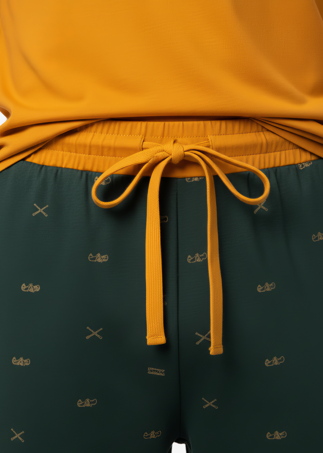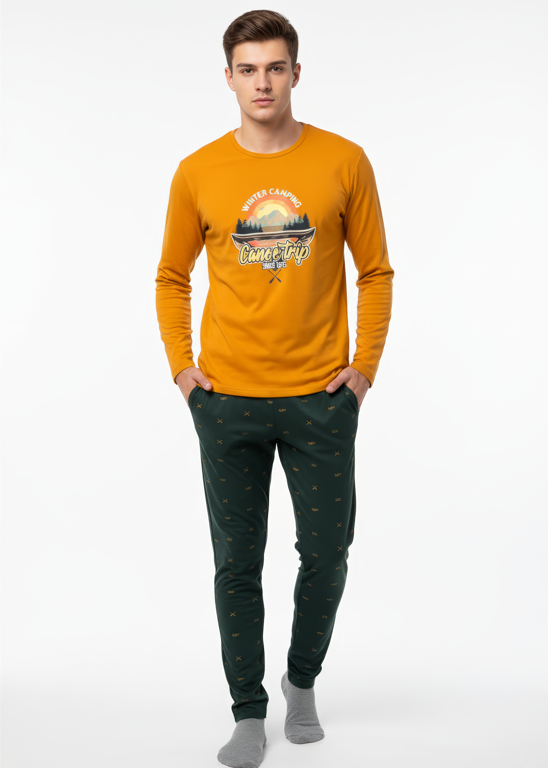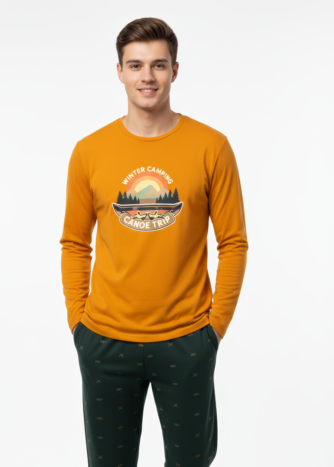 Este pijama mostaza de caballero en color perchado destaca por su comodidad y estilo. La camiseta presenta un diseño con un paisaje, una canoa y el texto "Winter camping. Canoe Trip", mientras que el pantalón cuenta con un estampado de símbolos relacionados con la canoa, ajustándose cómodamente a los tobillos. Ideal para quienes buscan confort y un toque único.