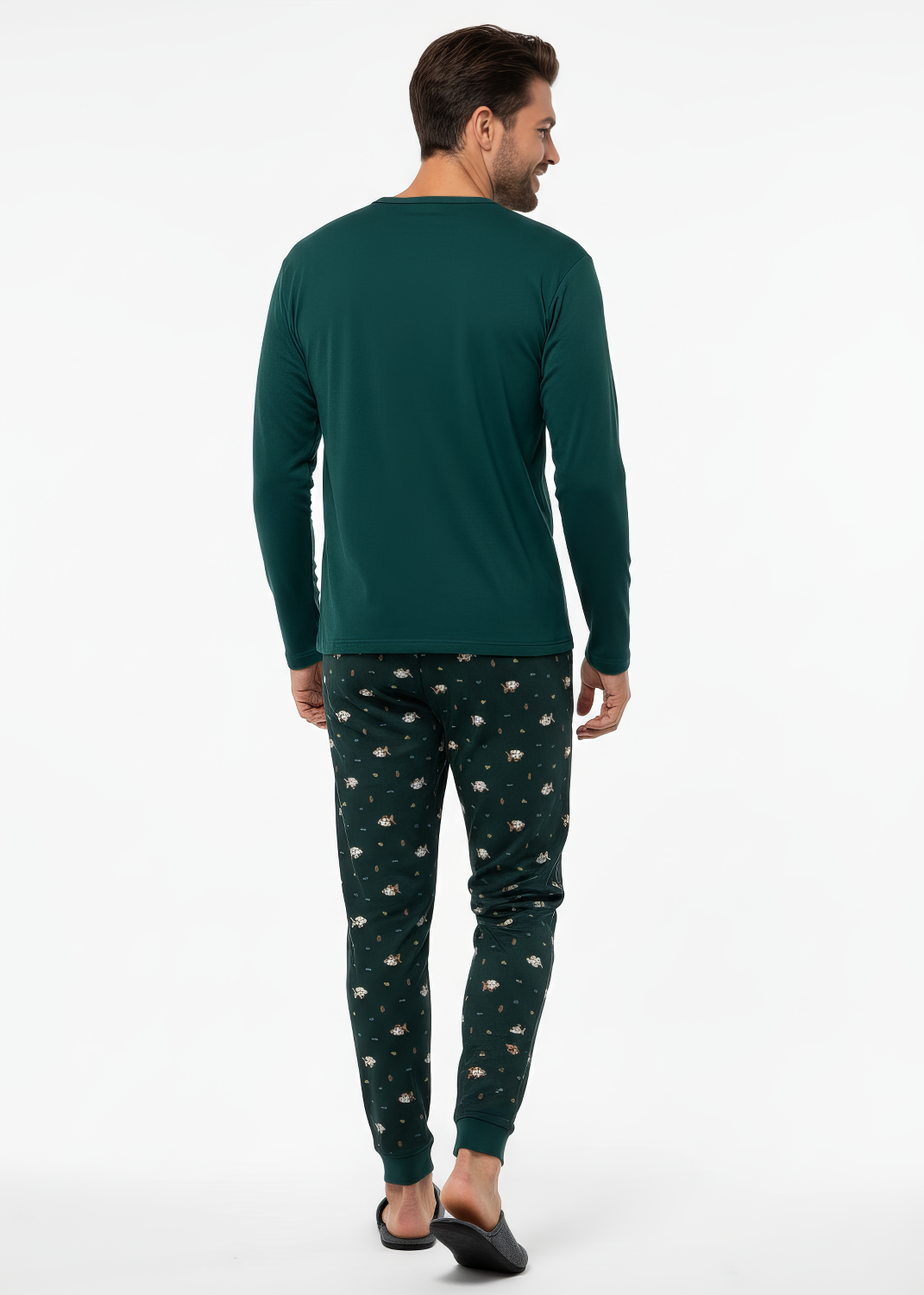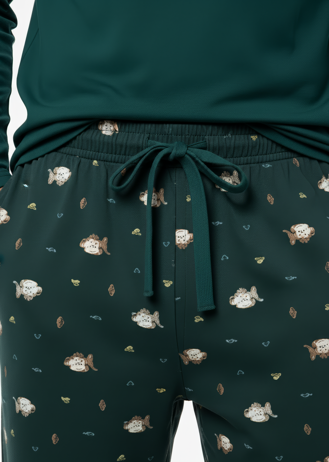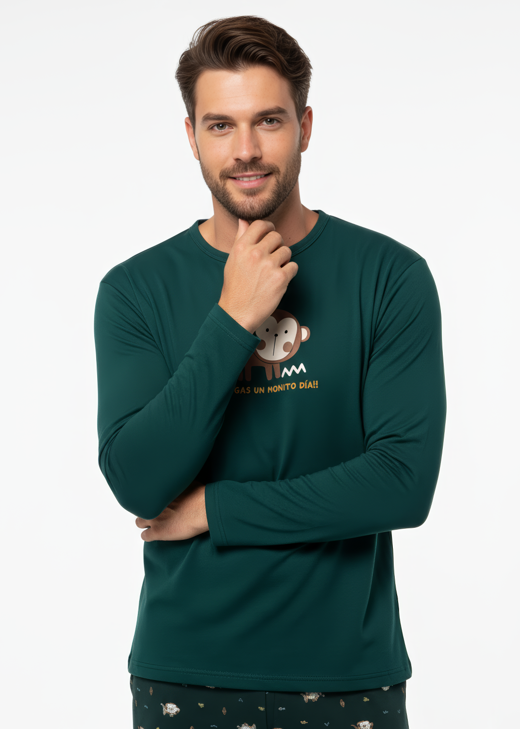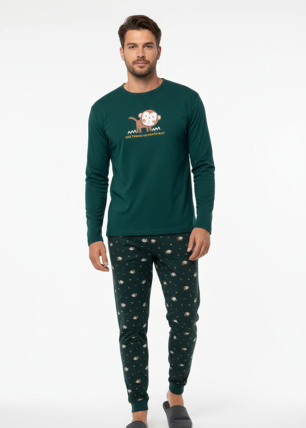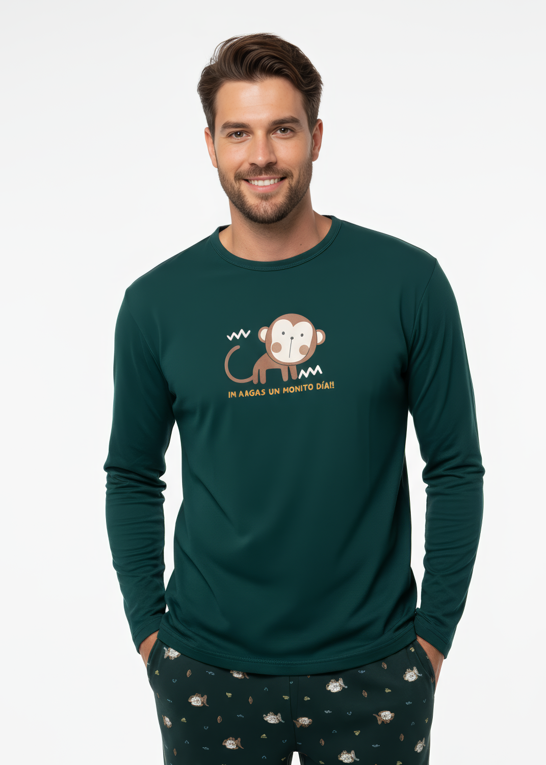 Pijama para hombre en suave tejido perchado color verde. La camiseta presenta un divertido diseño de mono acompañado de la frase "Que tengas un monito día". El pantalón, con estampado de monos a juego, se ajusta cómodamente al tobillo para un mejor ajuste.