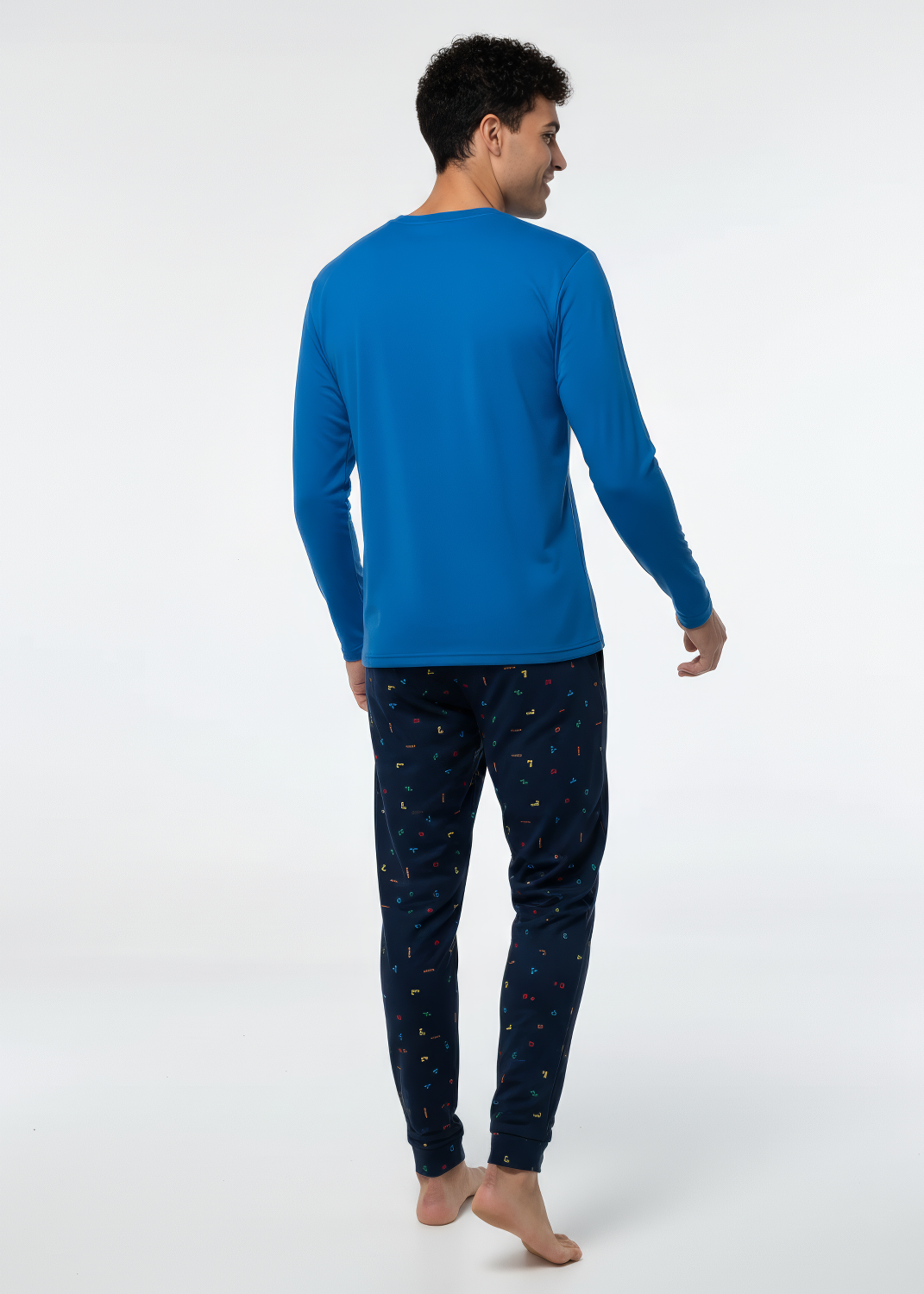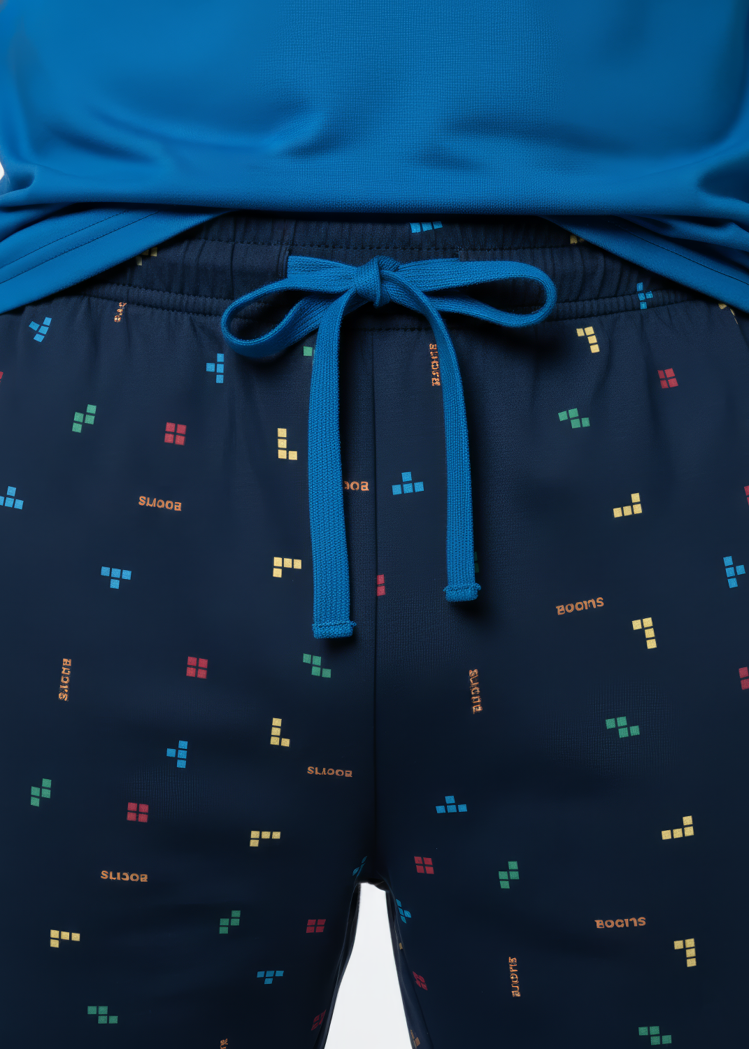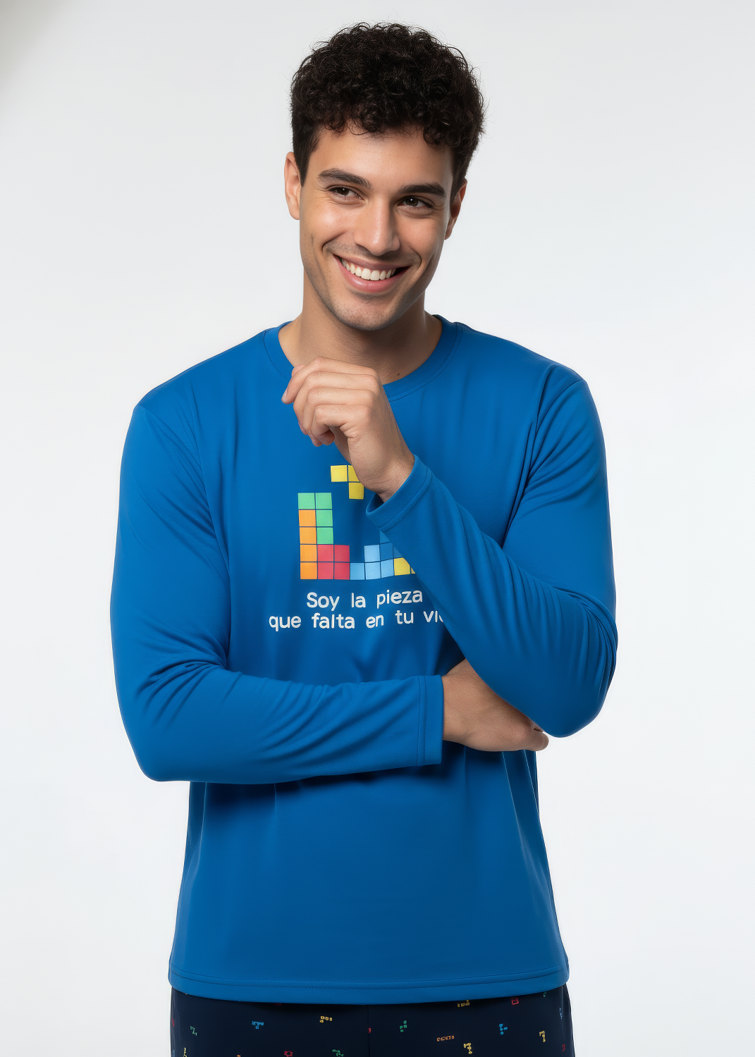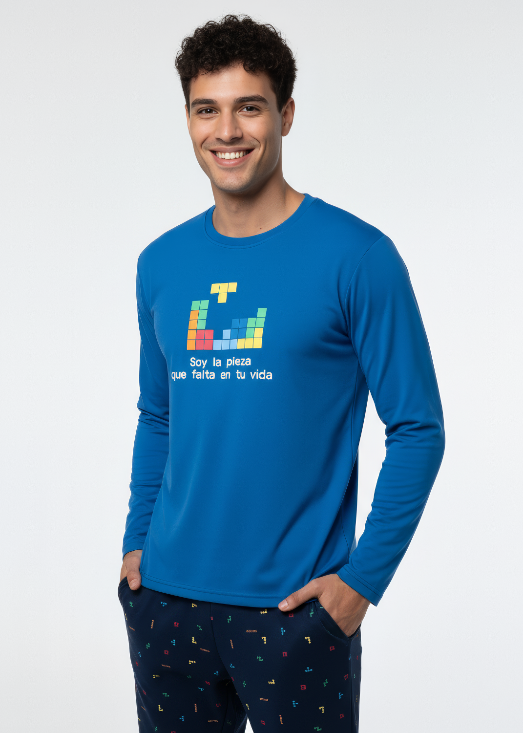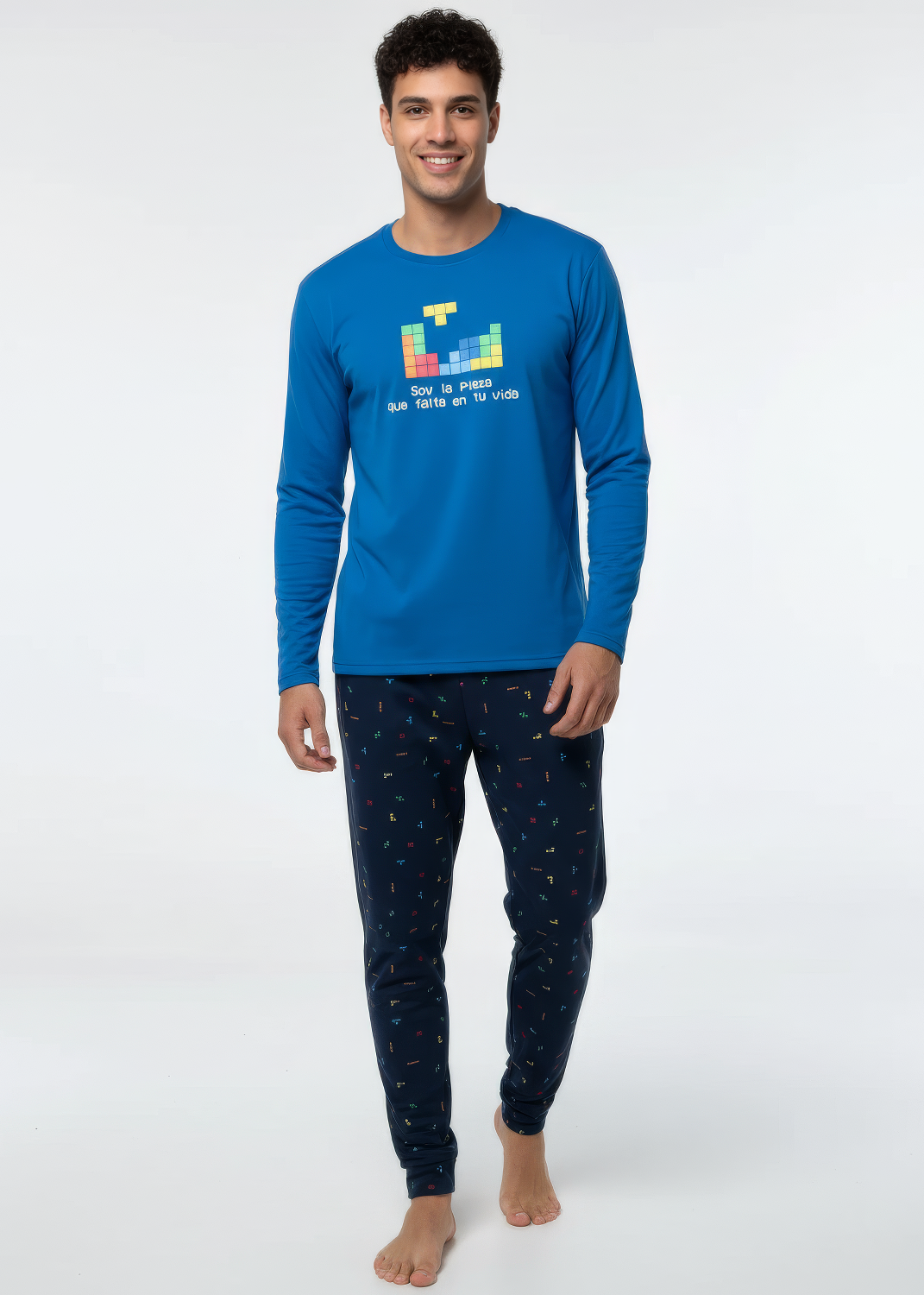 Este pijama perchado para hombre en color azul incluye una camiseta con un diseño de Tetris y la frase "Soy la pieza que falta en tu vida". El pantalón luce un estampado de piezas de Tetris en tonos vibrantes y se ajusta cómodamente en el tobillo, ofreciendo confort y estilo para tus momentos de descanso.