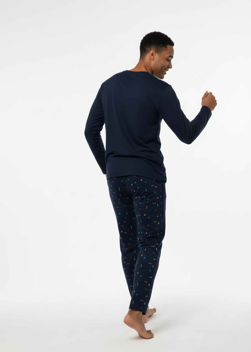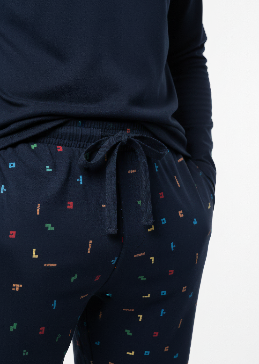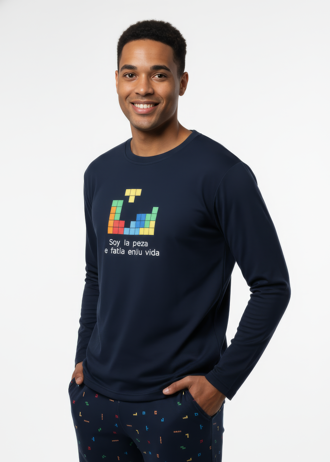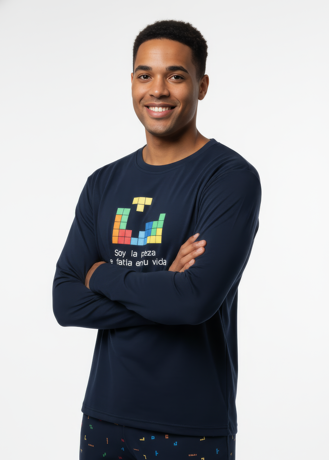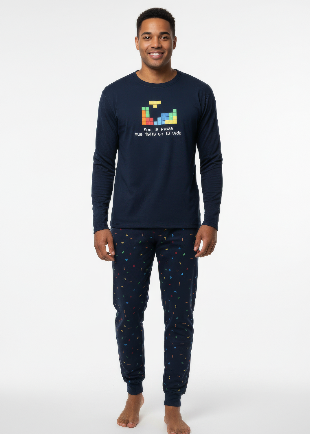 Este pijama perchado para hombre en color marino incluye una camiseta con un diseño de Tetris y la frase "Soy la pieza que falta en tu vida". El pantalón luce un estampado de piezas de Tetris en tonos vibrantes y se ajusta cómodamente en el tobillo, ofreciendo confort y estilo para tus momentos de descanso.
