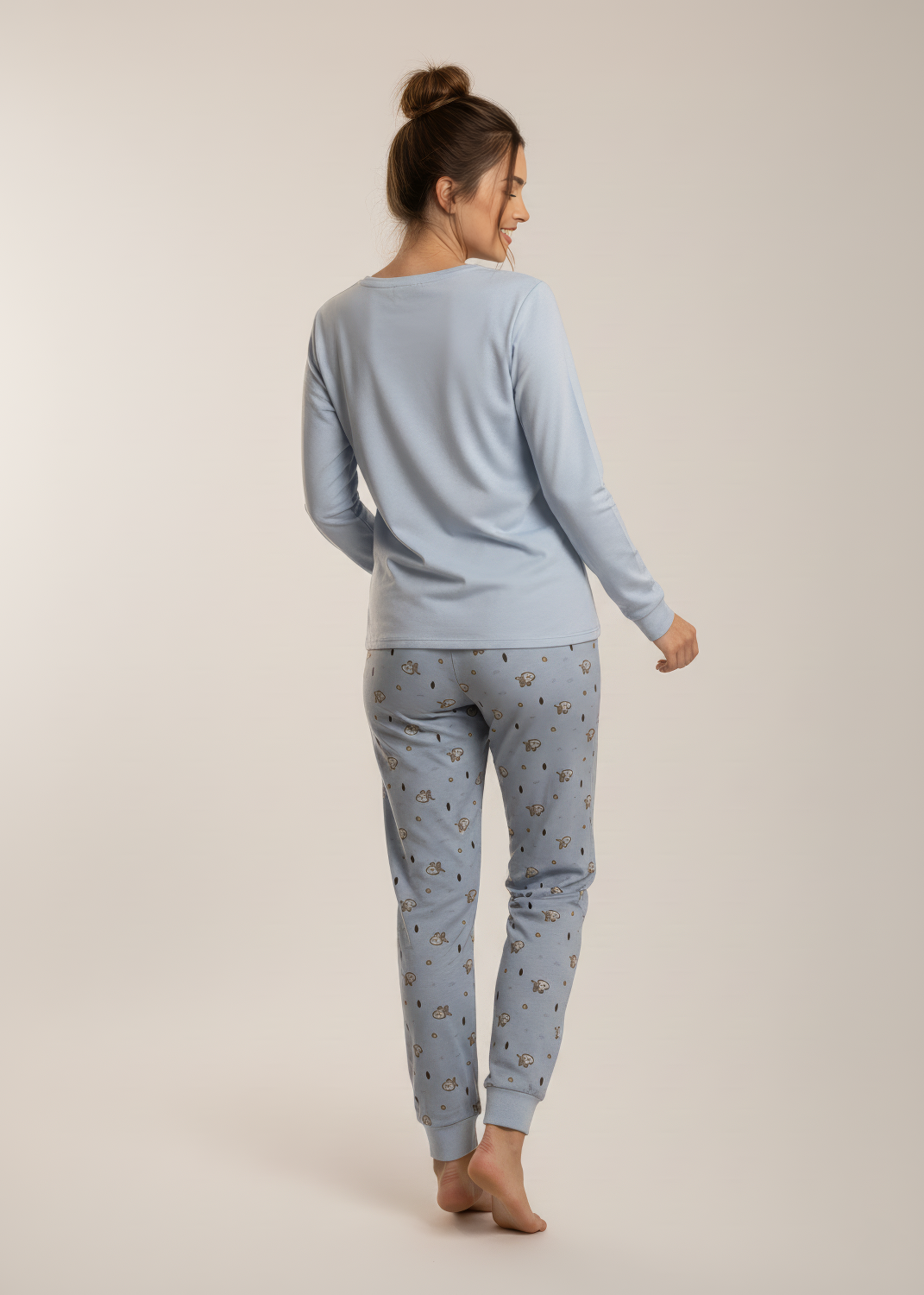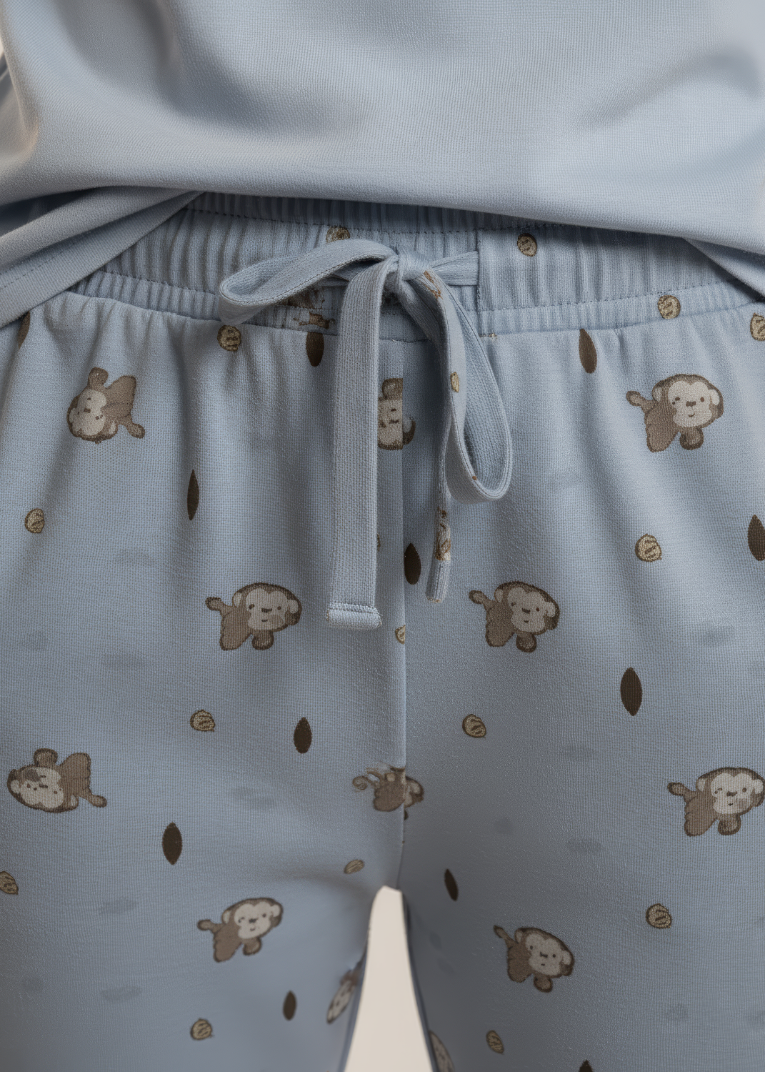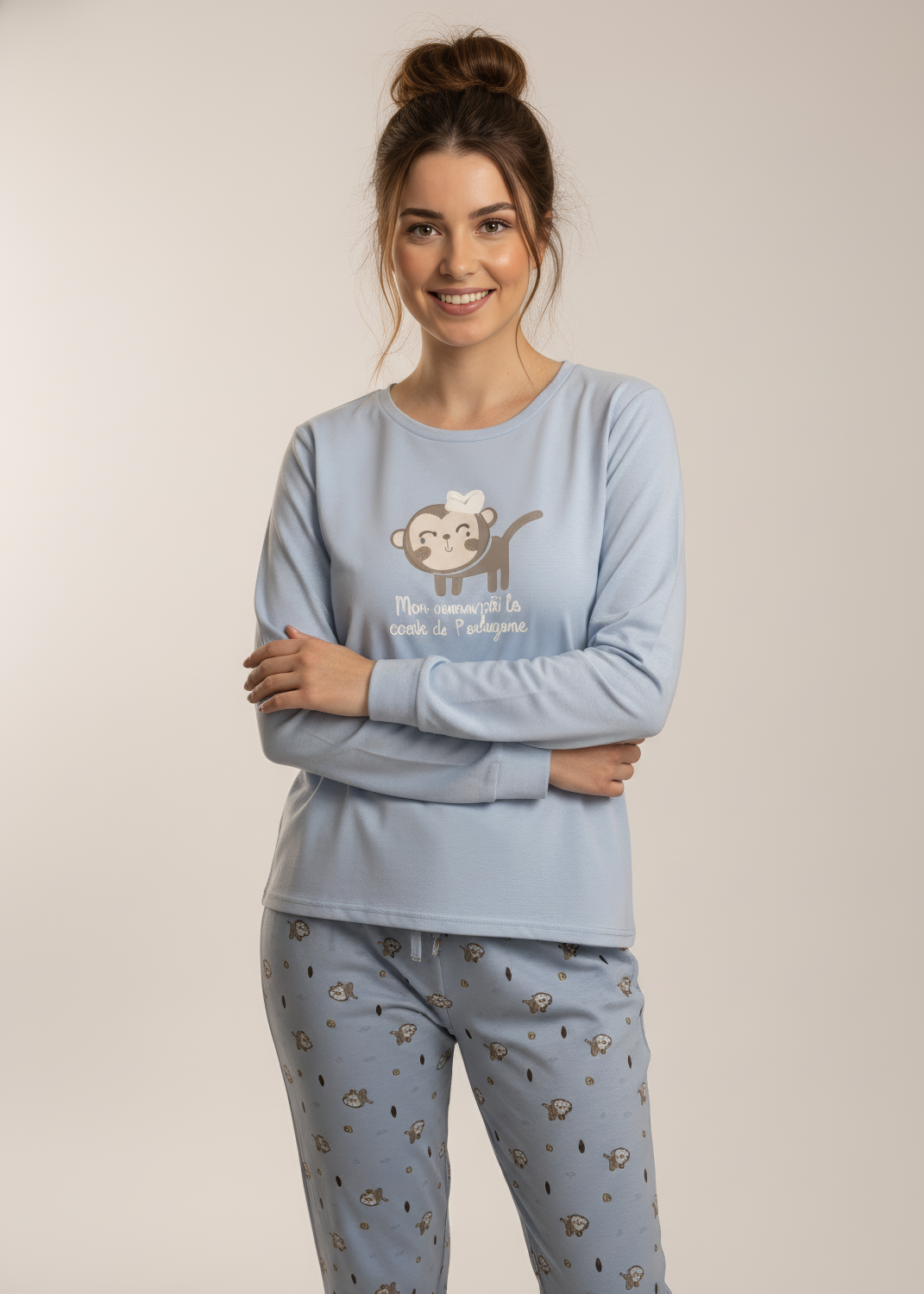 Pijama largo en tono celeste con tejido perchado para mayor comodidad. La camiseta presenta un monito con una flor y la frase divertida "Más mona que tu crush de Instagram". Las mangas y el borde del pantalón son ceñidos para un ajuste perfecto. El pantalón luce un estampado divertido de monitos y plátanos que añade un toque alegre a tu descanso.