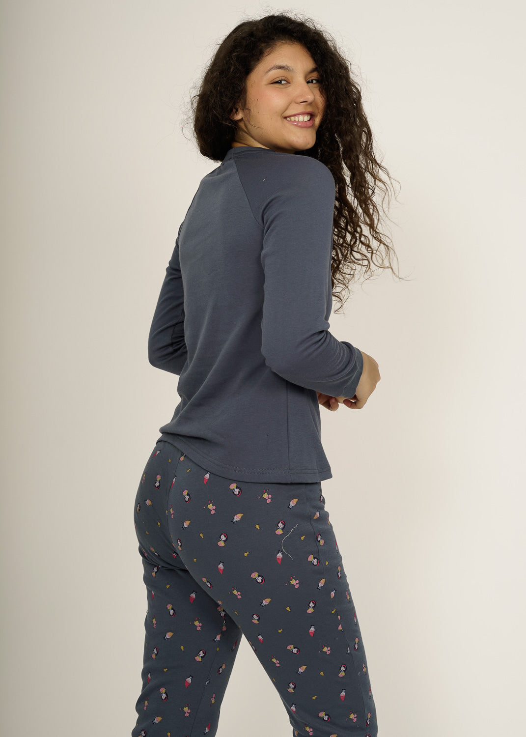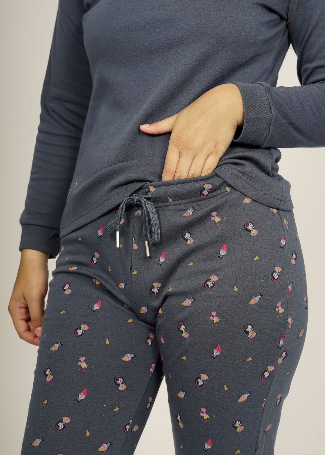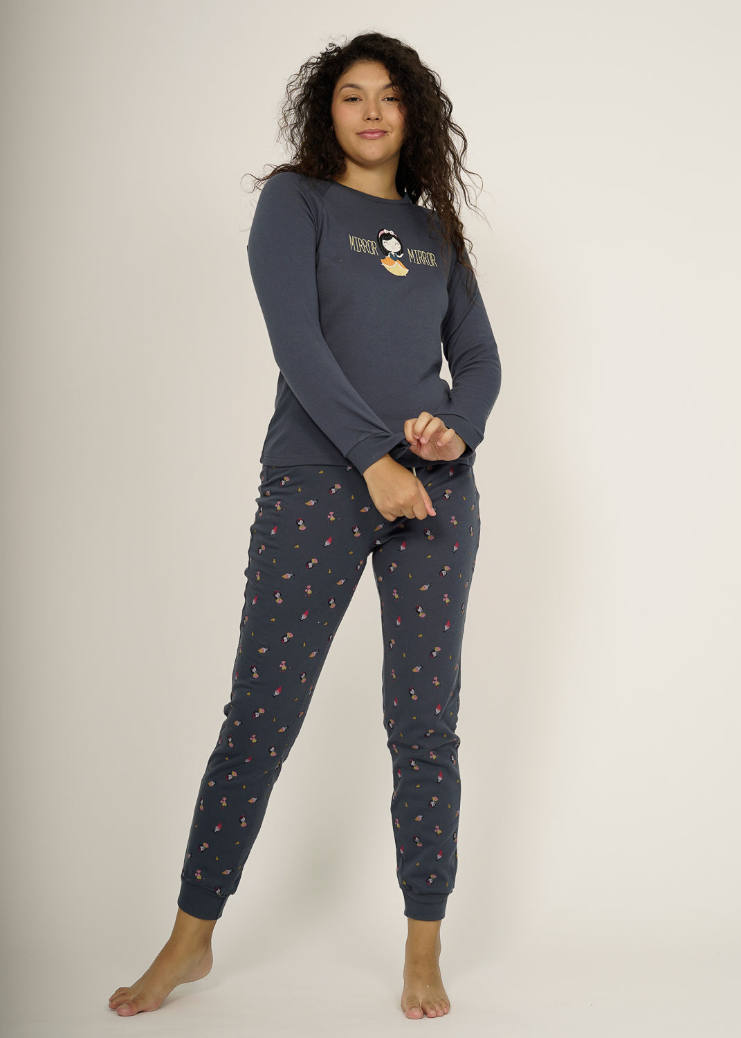 Pijama juvenil de algodón marino, camiseta con cuello redondo, tiene un diseño blancanieves y palabras "mirror mirror", perfecto para esos días de maratón de películas. Pantalón de estampados, acabando en puños.