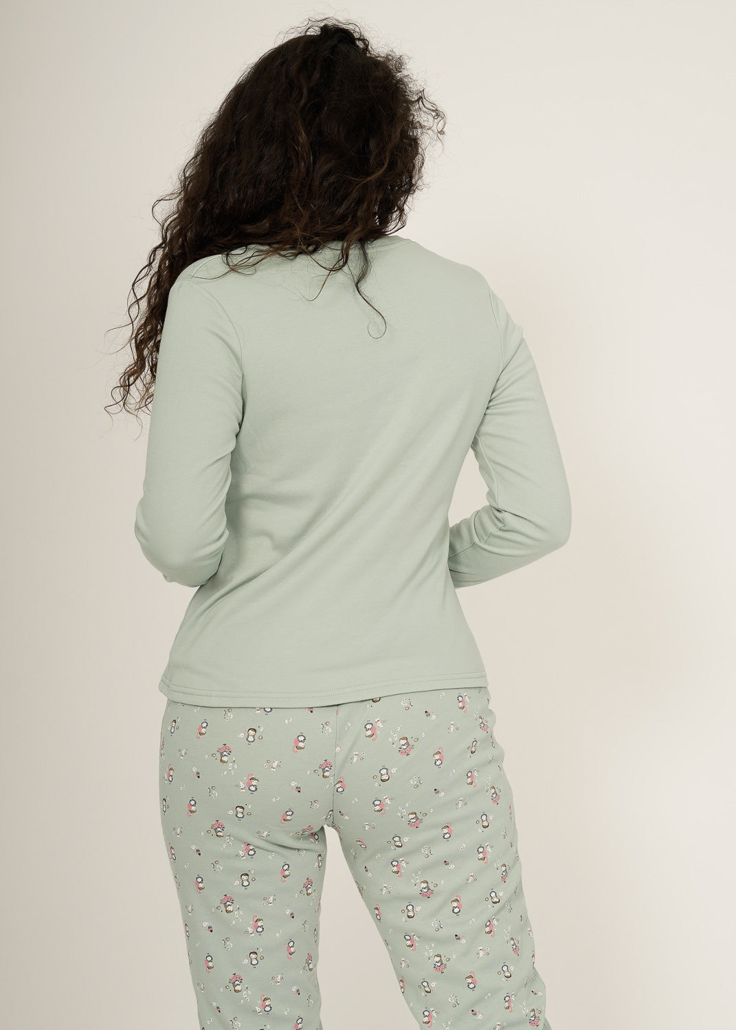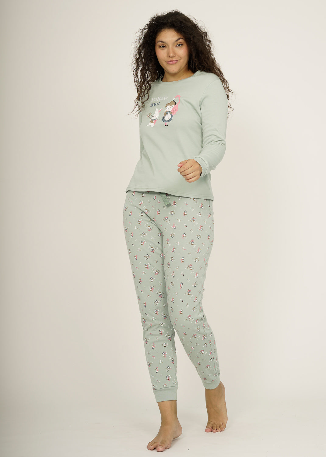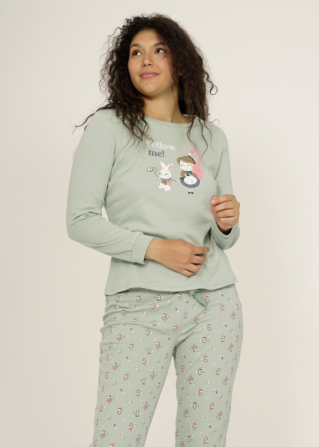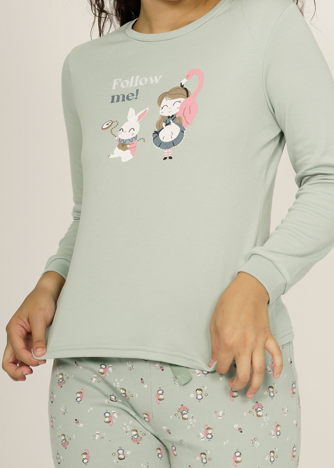 Pijama juvenil de algodón verde, camiseta con cuello redondo, tiene diseño de Alicia en el País de las Maravillas con la frase "Follow me!", perfecto para las ese momento de cine. Pantalón de estampados, acabando en puños.