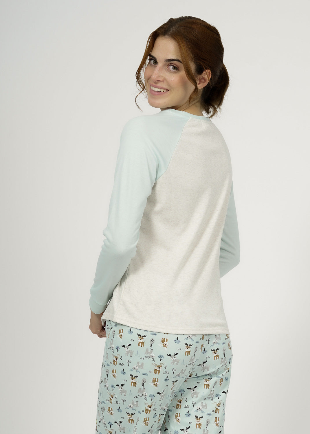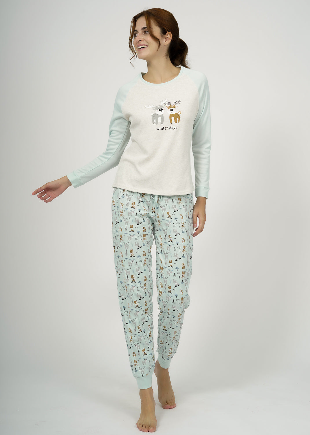 Pijama juvenil de algodón verde, camiseta con cuello redondo, mangas color verde y pecho y espalda claro, tiene un diseño de renos y frase "Winter Days", perfecto para esos días de maratón de películas con la mejor compañía. Pantalón de estampados, acabando en puños. El afelpado, por lo que tiene un liguero pelito por dentro de las prendas.