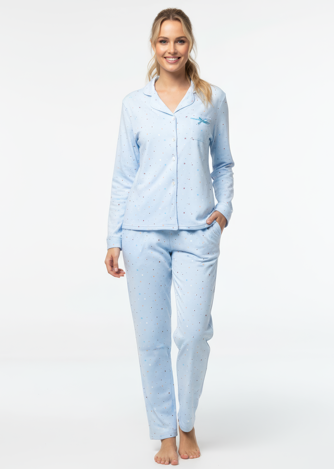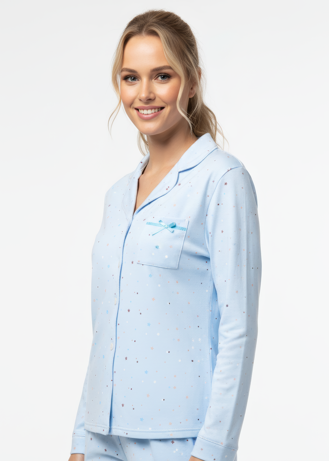 Este pijama de botones en suave perchado color celeste destaca por su estampado de pequeñas estrellas en tonos burdeos, blanco y beige, presentes tanto en la camisa como en el pantalón. Las mangas y el bajo del pantalón presentan un doblez elegante, mientras que la camisa incorpora un bolsillo con un delicado lazo decorativo, aportando un estilo sofisticado y acogedor para tus momentos de descanso.