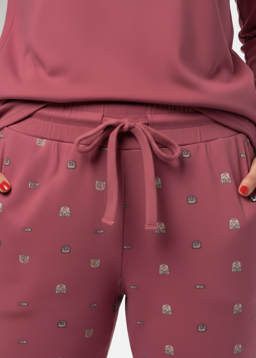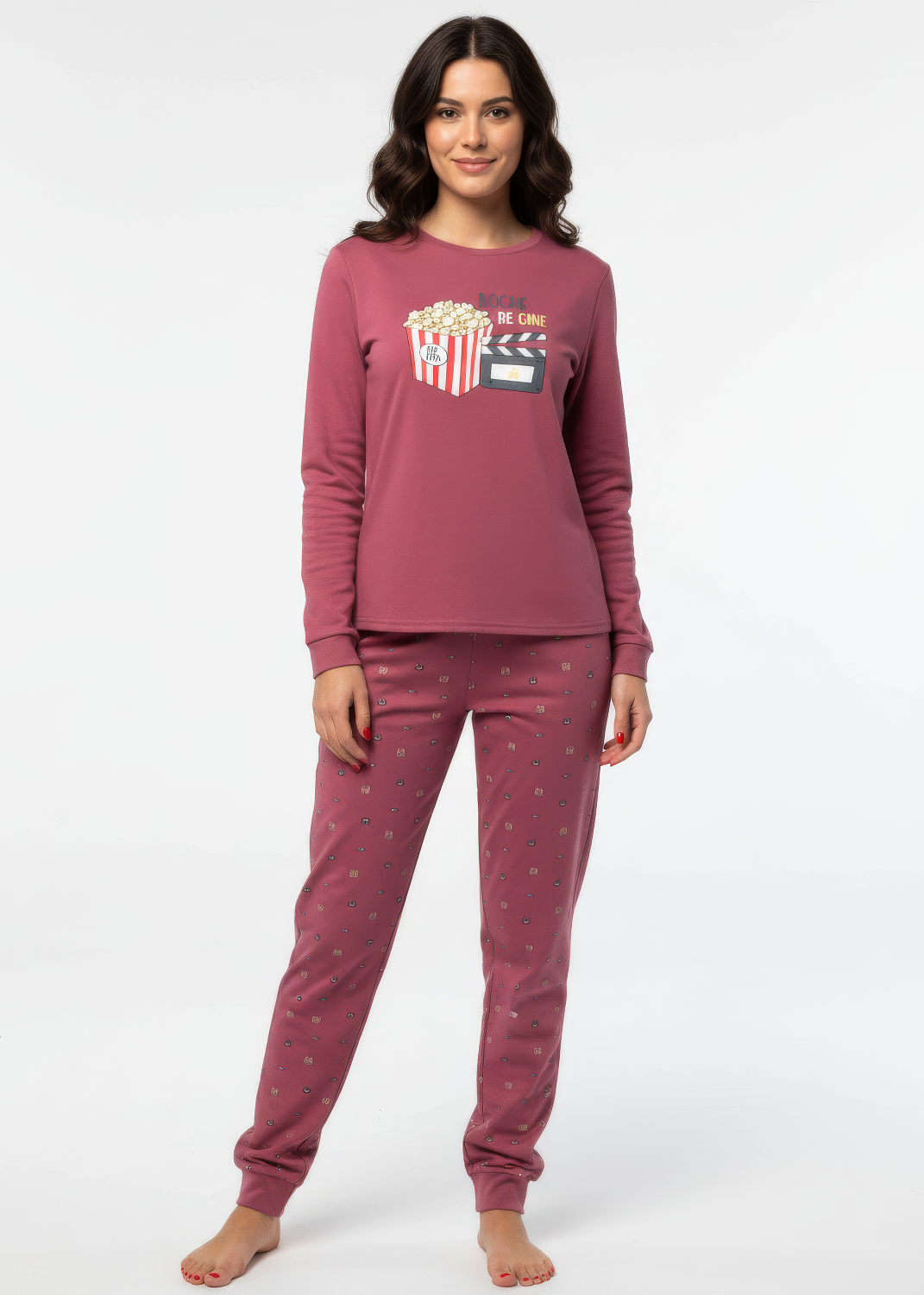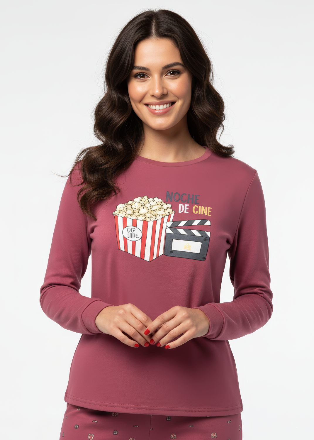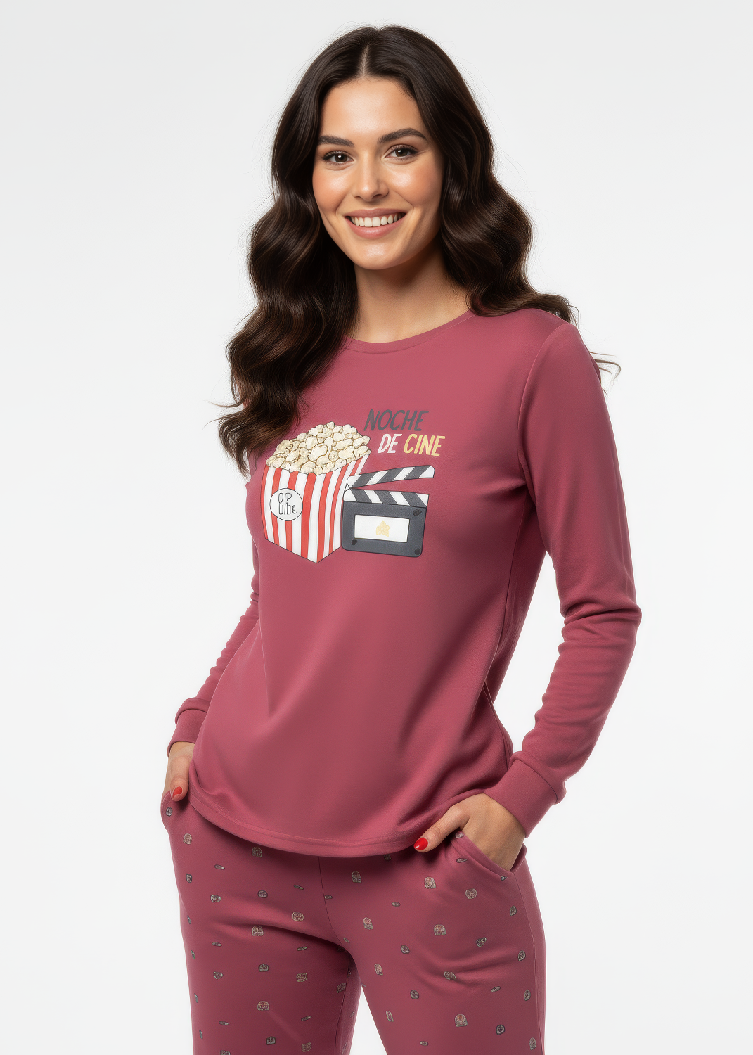 Disfruta de la comodidad del pijama perchado. La camiseta presenta un diseño divertido con un cubo de palomitas y una claqueta que lleva la frase "Noche de cine", con cuello redondo y mangas con puño para un ajuste perfecto. El pantalón ajustado al tobillo está decorado con estampados de cubos de palomitas y claquetas, ideal para una noche de película.