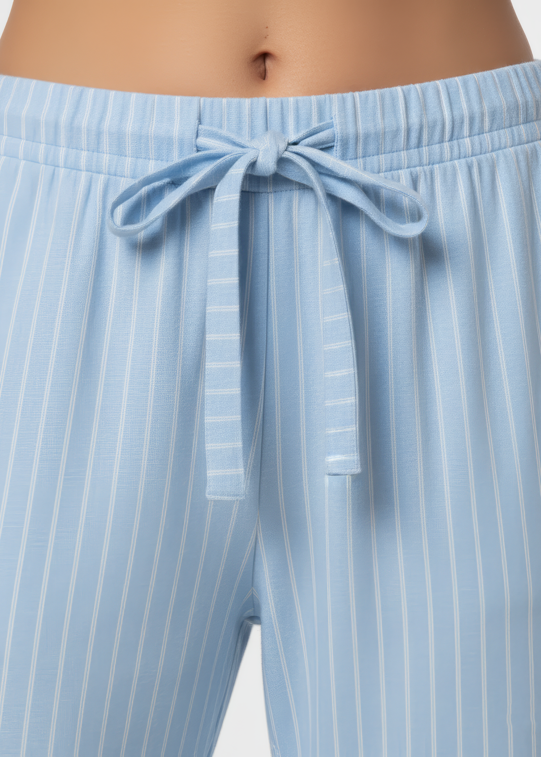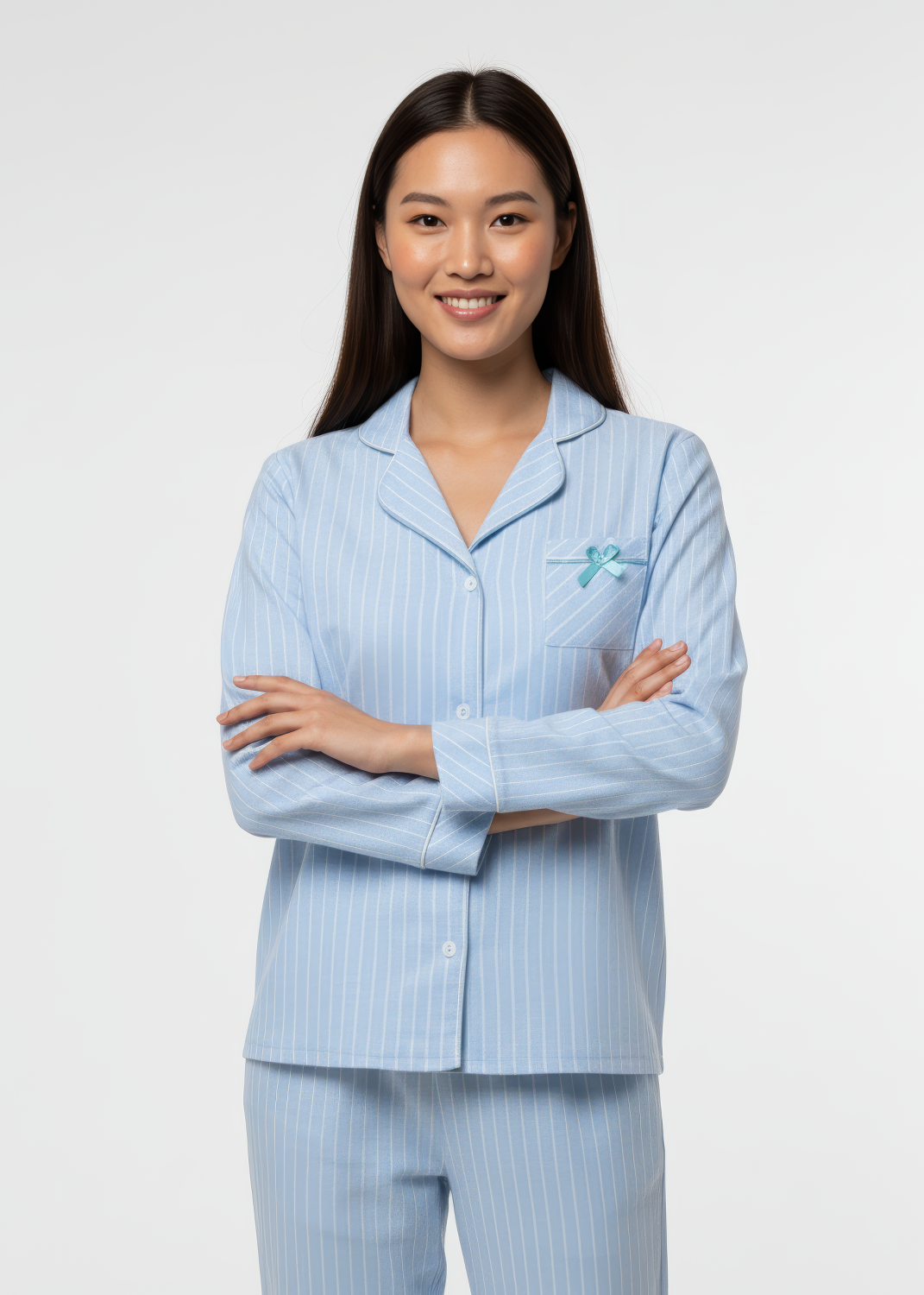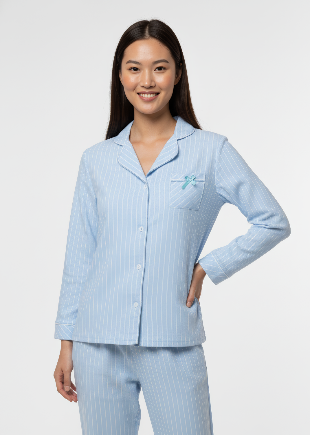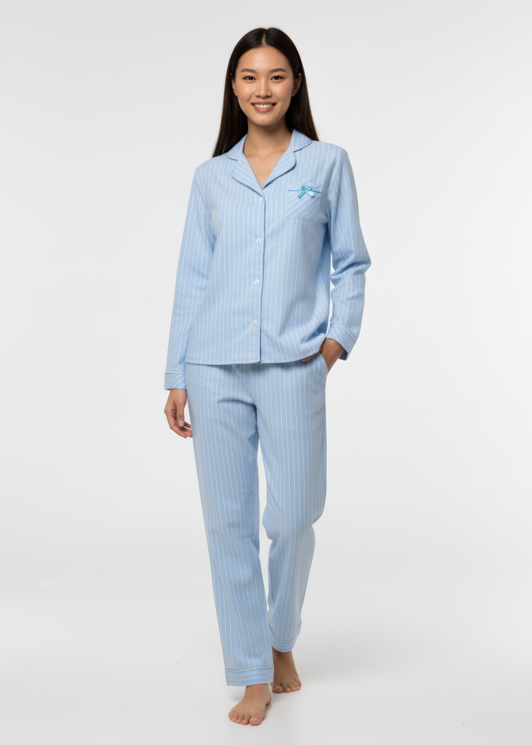 Este pijama largo perchado en color azul empolvado presenta un diseño de rayas claras. La camisa incluye un bolsillo adornado con un lazo, mientras que las mangas y el dobladillo del pantalón cuentan con un acabado doblado que aporta un toque elegante y cómodo. Ideal para disfrutar de un descanso con estilo.