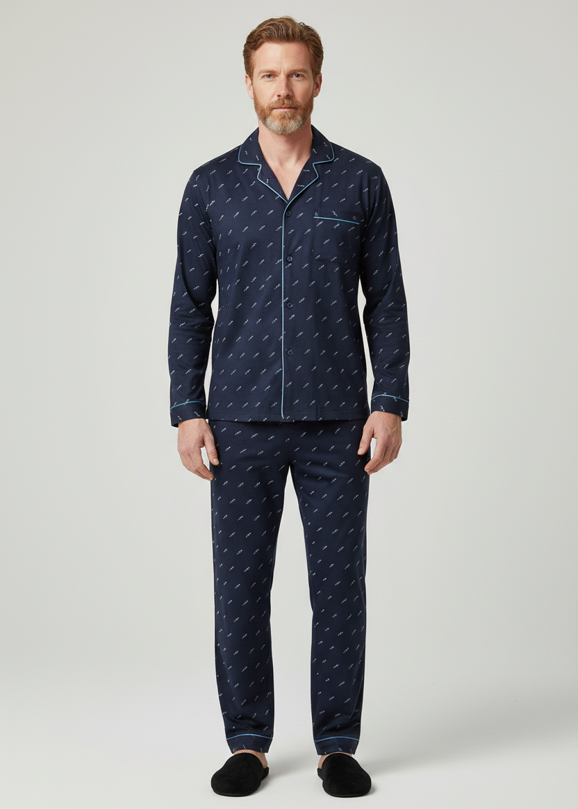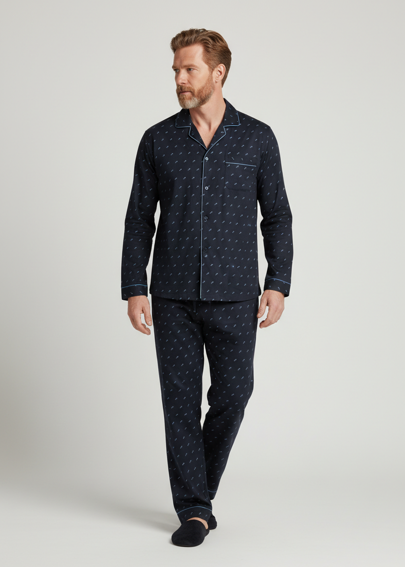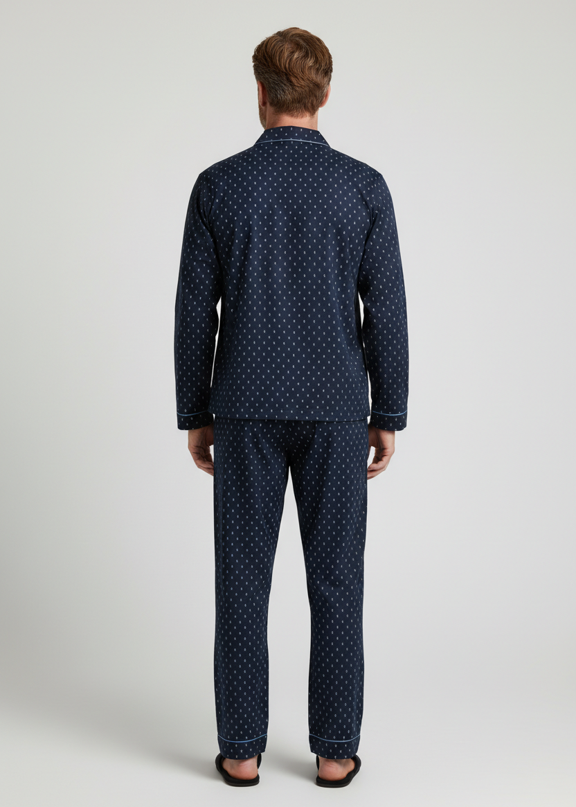 Disfruta de noches de descanso absoluto con este elegante pijama de caballero en verde caqui. La camisa de manga larga con cuello y botones frontales se combina perfectamente con el pantalón largo y recto, creando un conjunto sofisticado y cómodo. El sutil estampado de pequeños puntos blancos aporta un toque de distinción, mientras que los ribetes en tonos oscuros en cuello, puños y tapeta de botones realzan su elegancia. Ideal para quien busca prendas de calidad que combinen estilo clásico con comodidad durante el descanso.