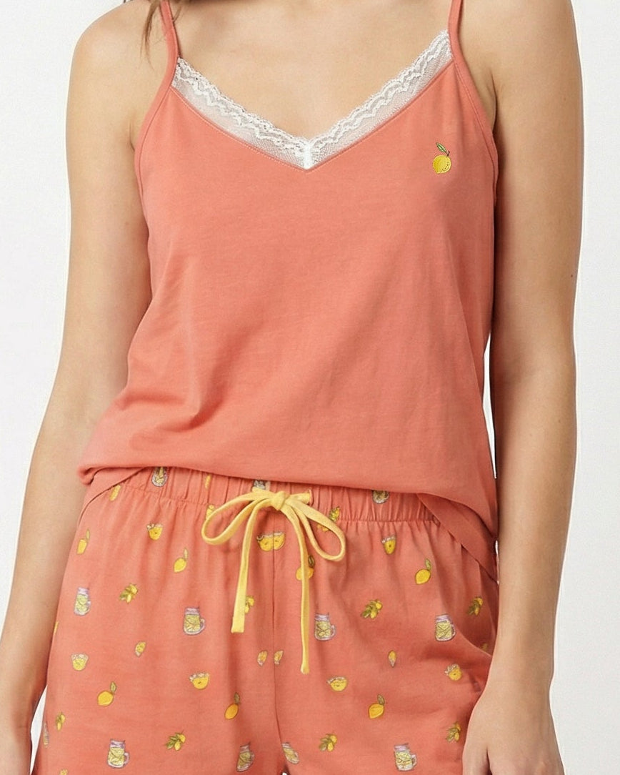 Despierta tu lado más fresco con este pijama corto que combina comodidad y diversión. La camiseta de tirantes finos en coral vibrante luce un delicado escote de encaje blanco y un bordado de limón que añade un toque de elegancia. Los shorts a juego presentan un alegre estampado de limones y limonadas, mientras que el cordón amarillo brillante en la cintura permite un ajuste perfecto. Ideal para noches de verano o para relajarte en casa con estilo. Un diseño fresco que te hará sonreír cada vez que lo uses.