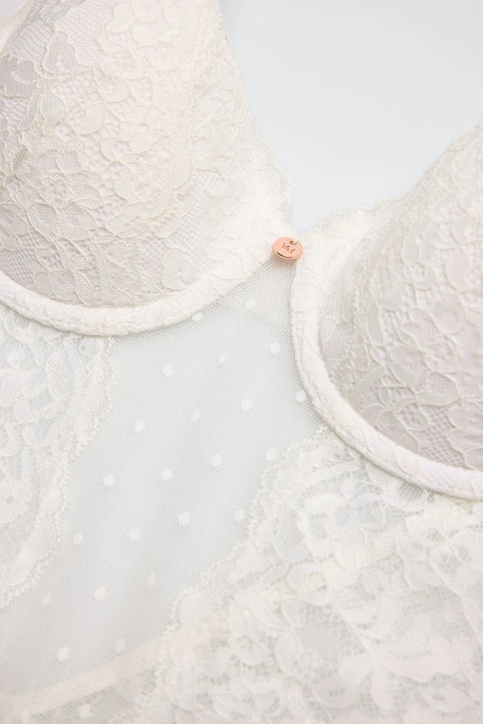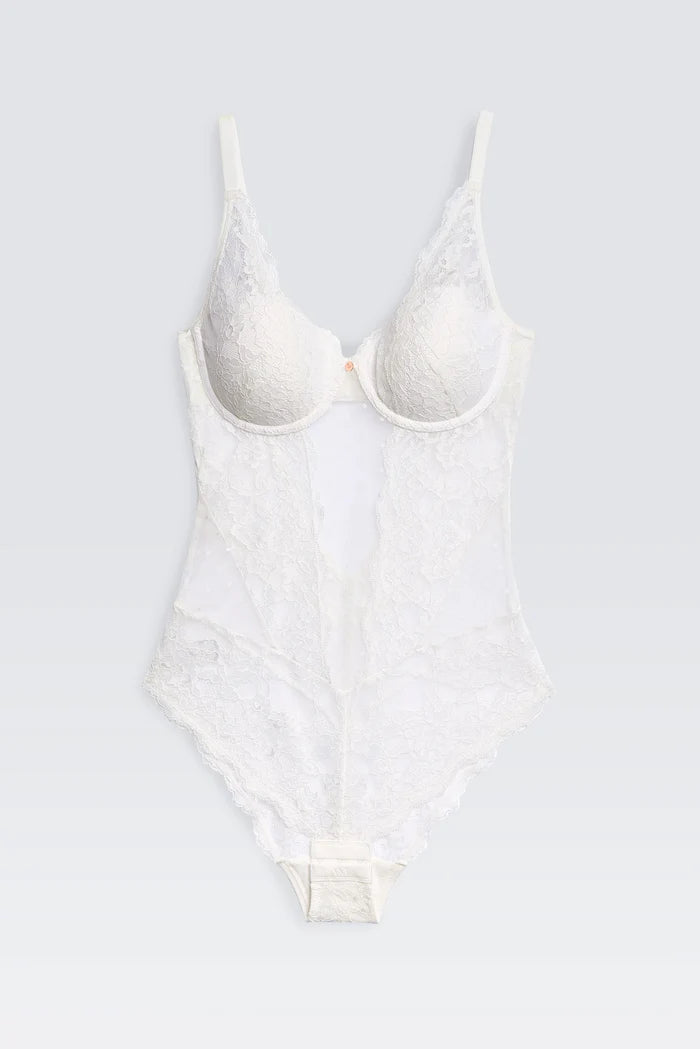 Body Encaje Cava Ysabel Mora: la prenda lencera que realza tu belleza con sofisticación. Diseñado con encaje y plumeti en combinación exquisita, sus copas escotadas con efecto push up favorecen tu figura y se adaptan perfectamente bajo prendas con escote abierto. El doble cierre —trasero en la espalda y corchetes ajustables inferiores— garantiza comodidad y versatilidad. La transparencia delicada del plumeti y la blonda crean un look cautivador, ideal para novias o momentos donde deseas sentirte sensual y segura.