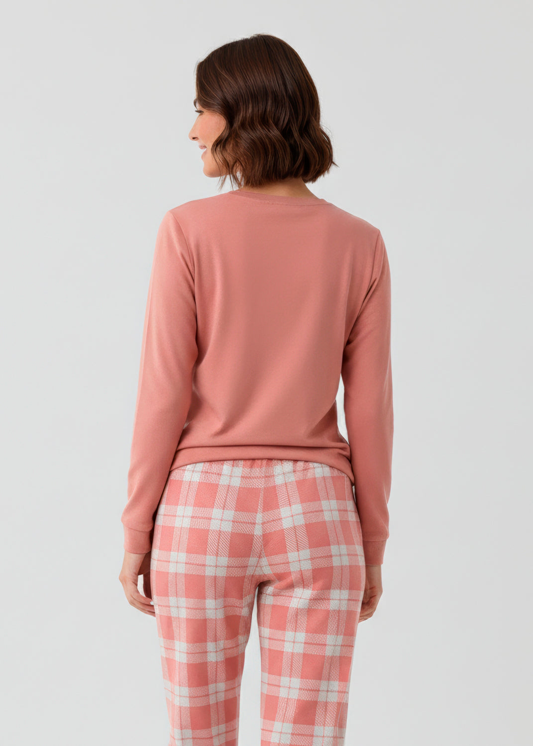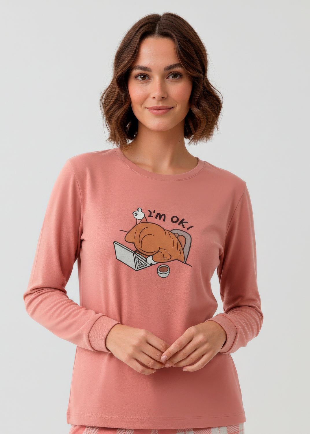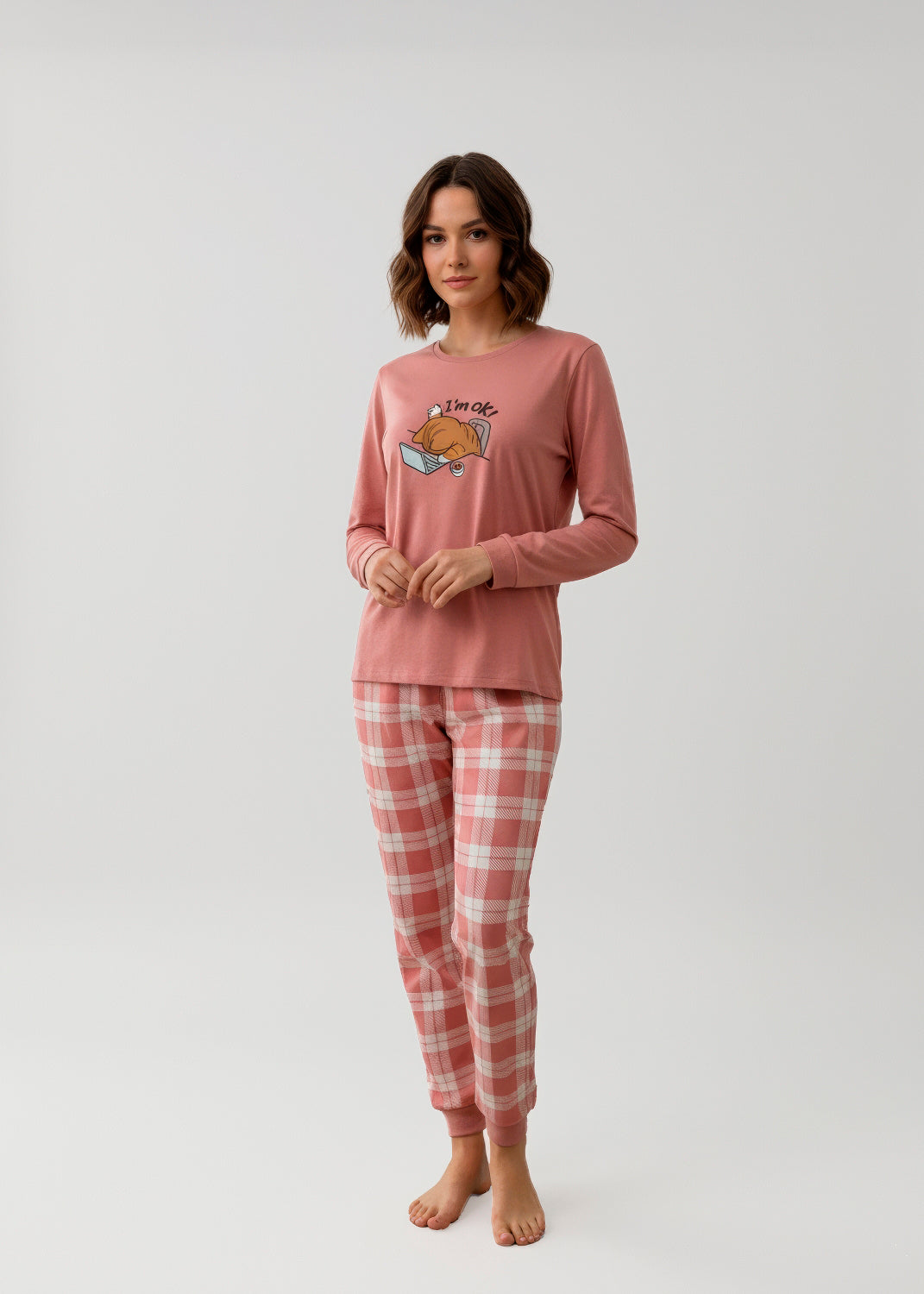 Este pijama largo en suave algodón rosa empolvado ofrece comodidad y un toque original. La camiseta presenta un diseño divertido con un gato frente a un portátil acompañado por la frase "I'm OK", y cuenta con un cuello redondo y puños en las mangas. El pantalón, con un elegante estampado tartán, completa un conjunto perfecto para relajarte con estilo y confort en casa.