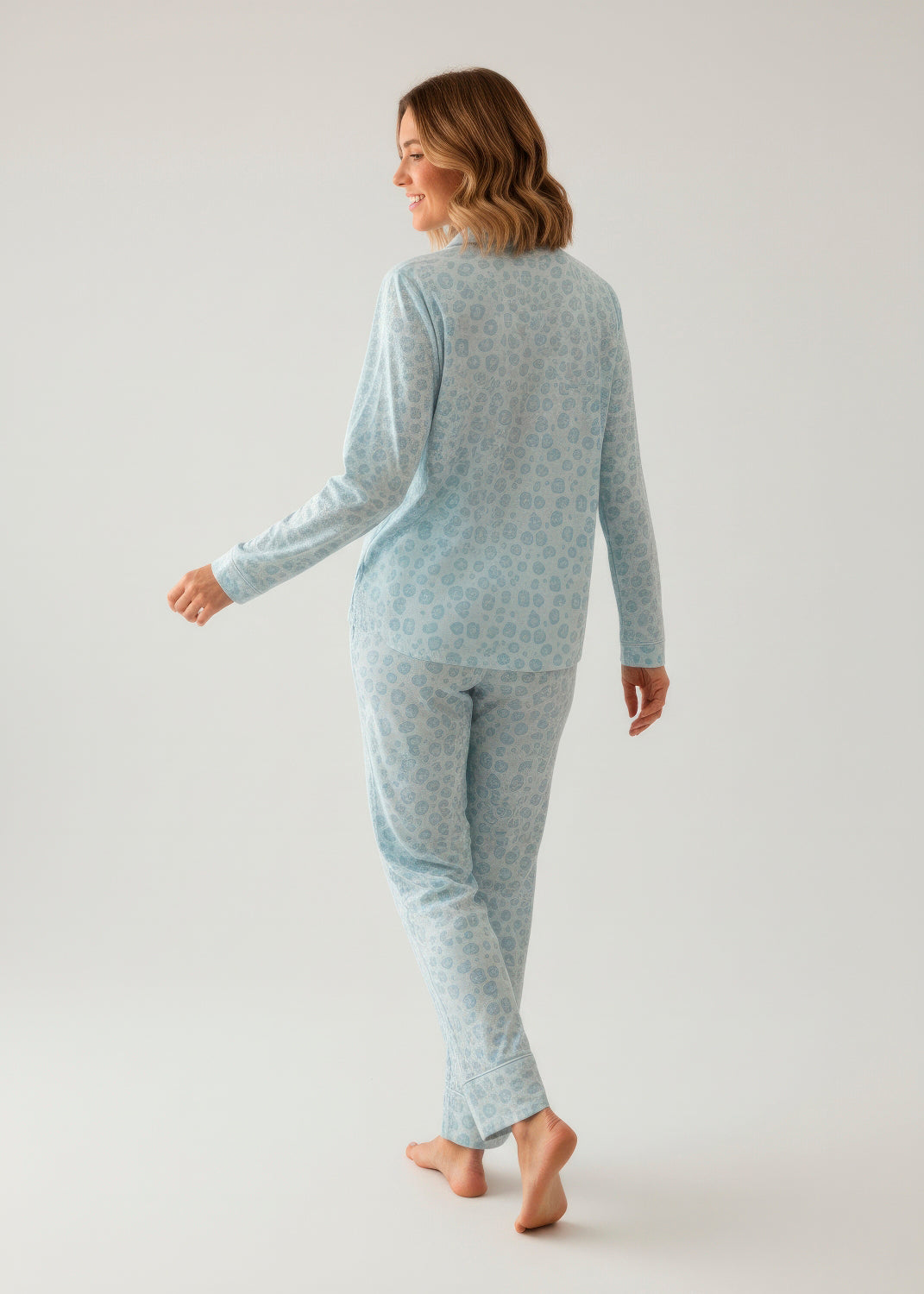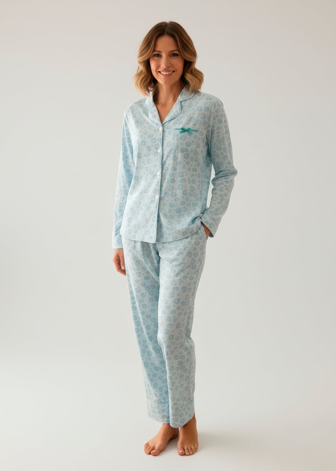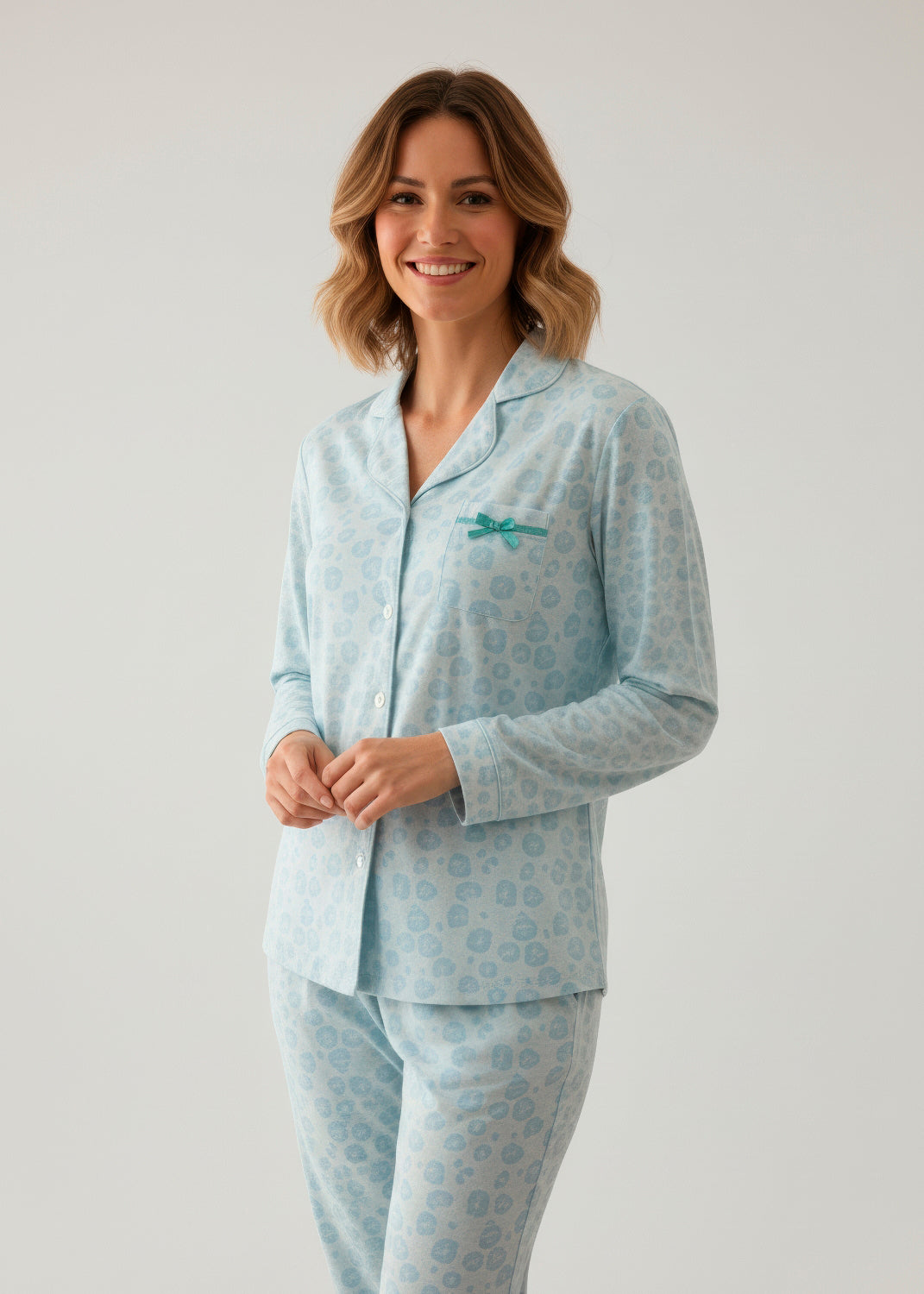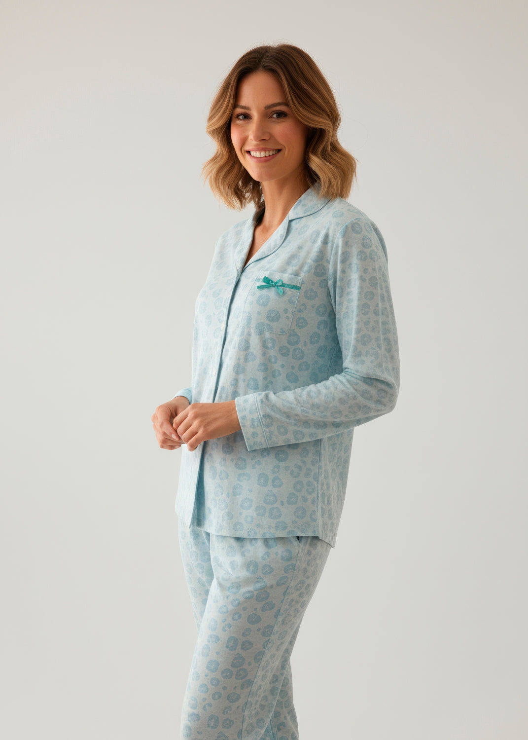 Este pijama largo de algodón es ideal para el invierno. Cuenta con una camisa de botones y un estampado de leopardo en un delicado tono celeste. La camisa incluye un bolsillo decorado con un lazo que aporta un toque encantador.