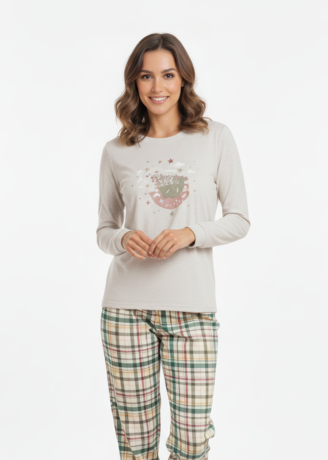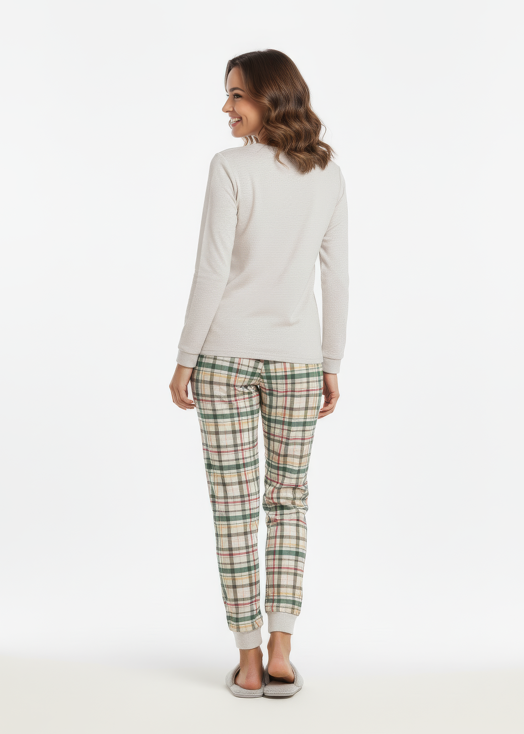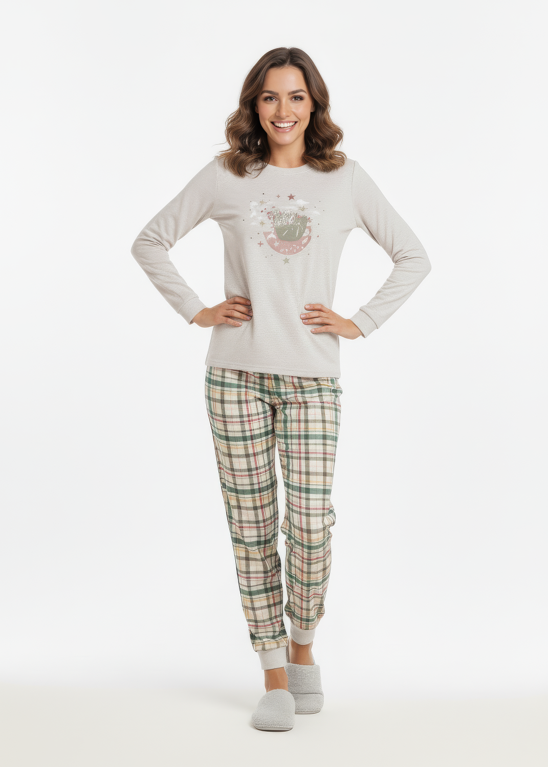 Este pijama largo perchado combina comodidad y estilo. La camiseta en tono beige presenta un tierno diseño de un osito dormido sobre la luna, rodeado de estrellas y nubes. Las mangas y el borde inferior del pantalón son ceñidos para un mejor ajuste. El pantalón luce un estampado tartán que armoniza perfectamente con la camiseta. Ideal para relajarte con elegancia y calidez.