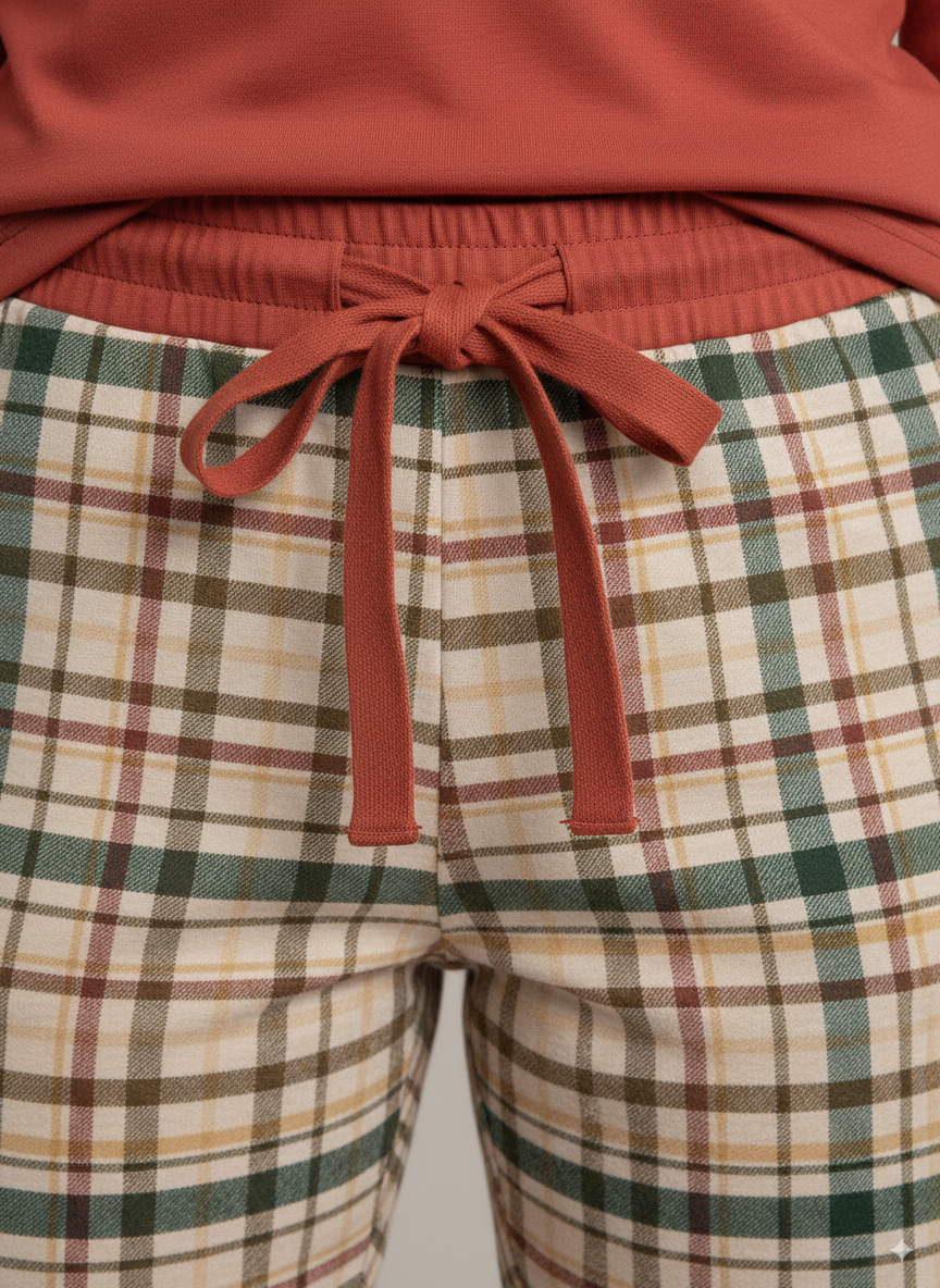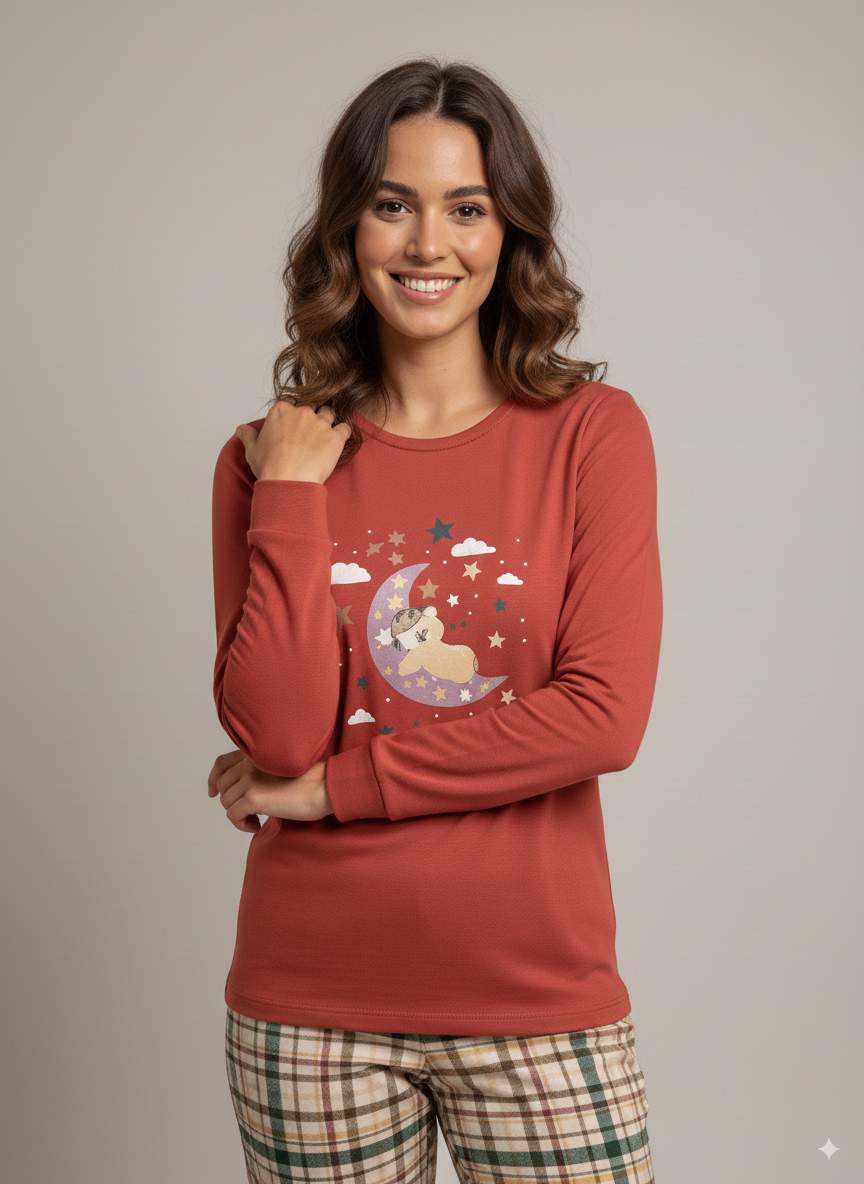 Este pijama largo perchado combina comodidad y estilo. La camiseta en tono caldera presenta un tierno diseño de un osito dormido sobre la luna, rodeado de estrellas y nubes. Las mangas y el borde inferior del pantalón son ceñidos para un mejor ajuste. El pantalón luce un estampado tartán que armoniza perfectamente con la camiseta. Ideal para relajarte con elegancia y calidez.