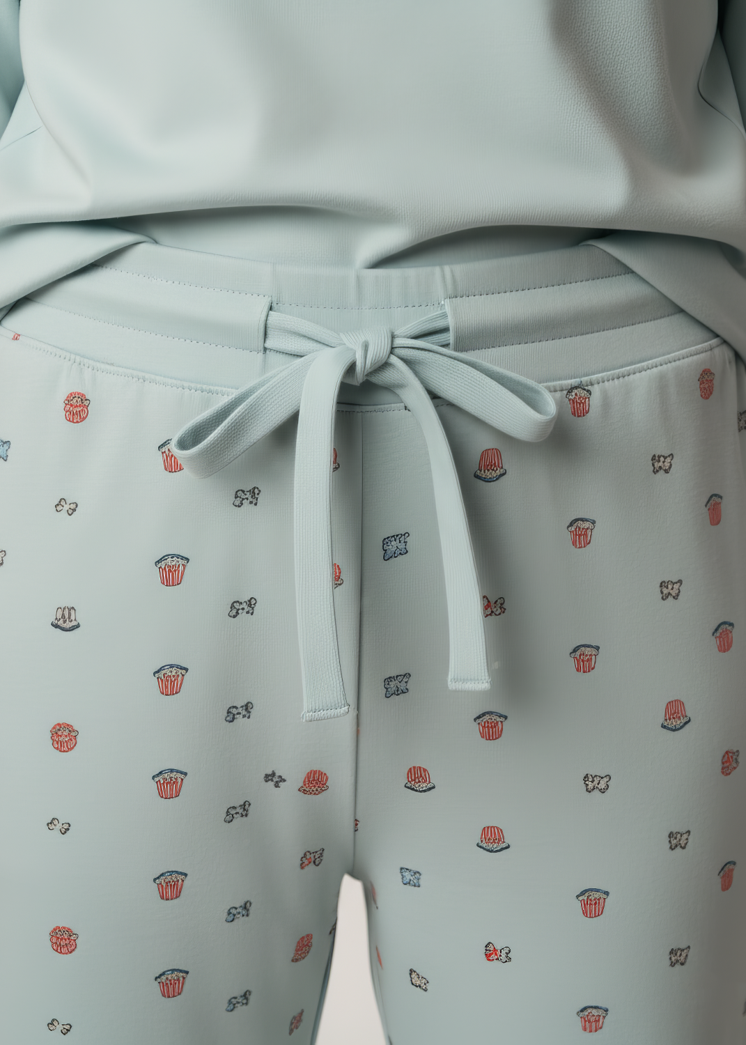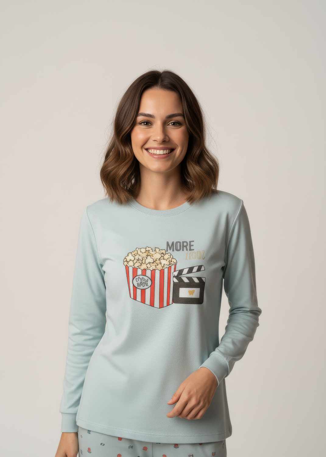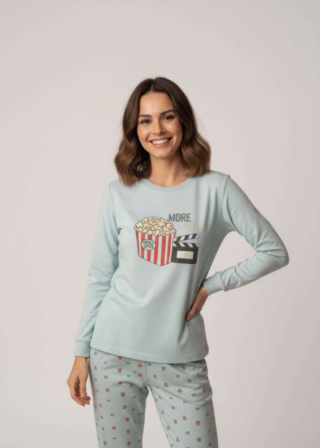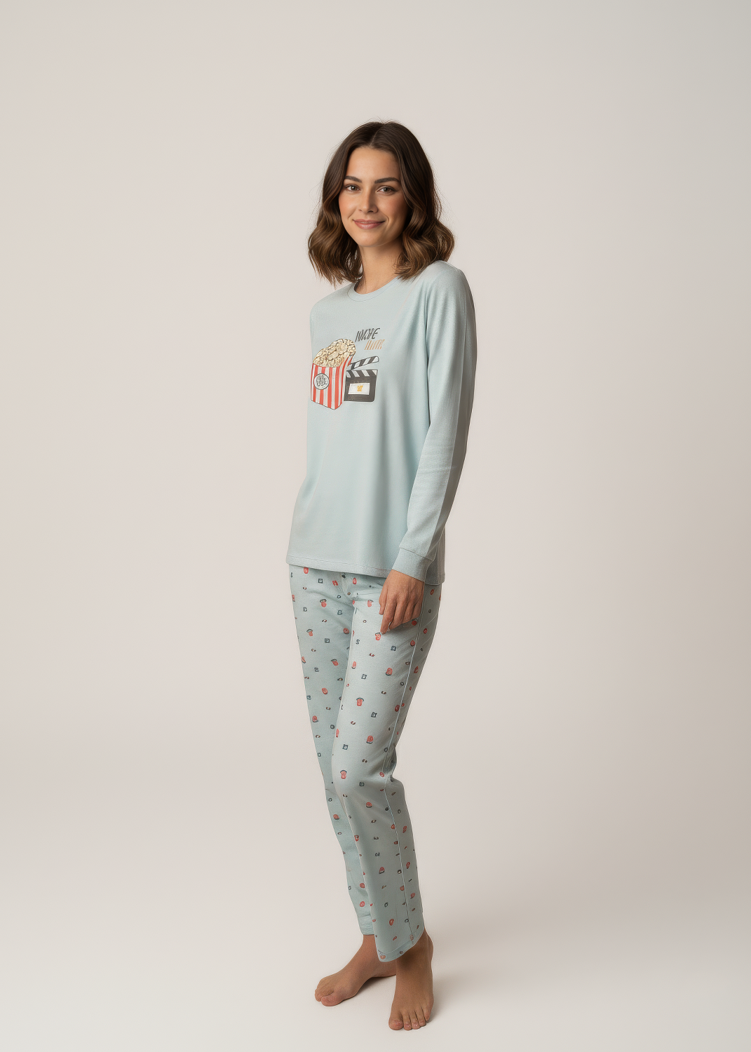 Disfruta de la comodidad del pijama perchado. La camiseta presenta un diseño divertido con un cubo de palomitas y una claqueta que lleva la frase "Noche de cine", con cuello redondo y mangas con puño para un ajuste perfecto. El pantalón ajustado al tobillo está decorado con estampados de cubos de palomitas y claquetas, ideal para una noche de película.