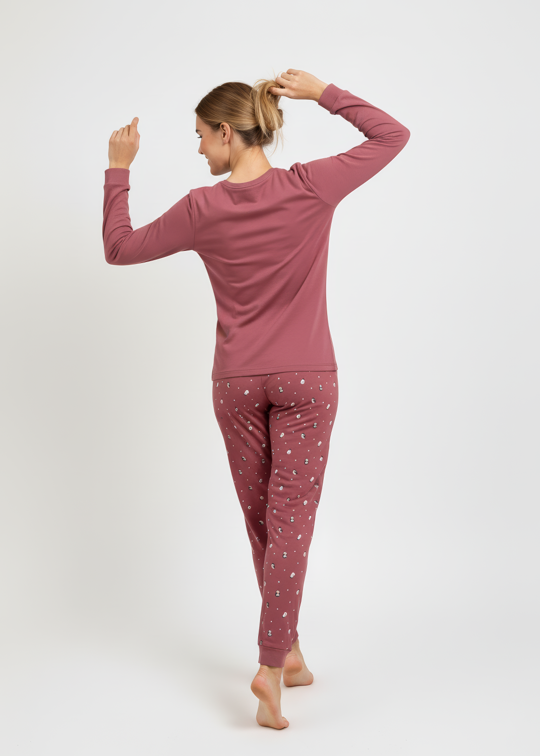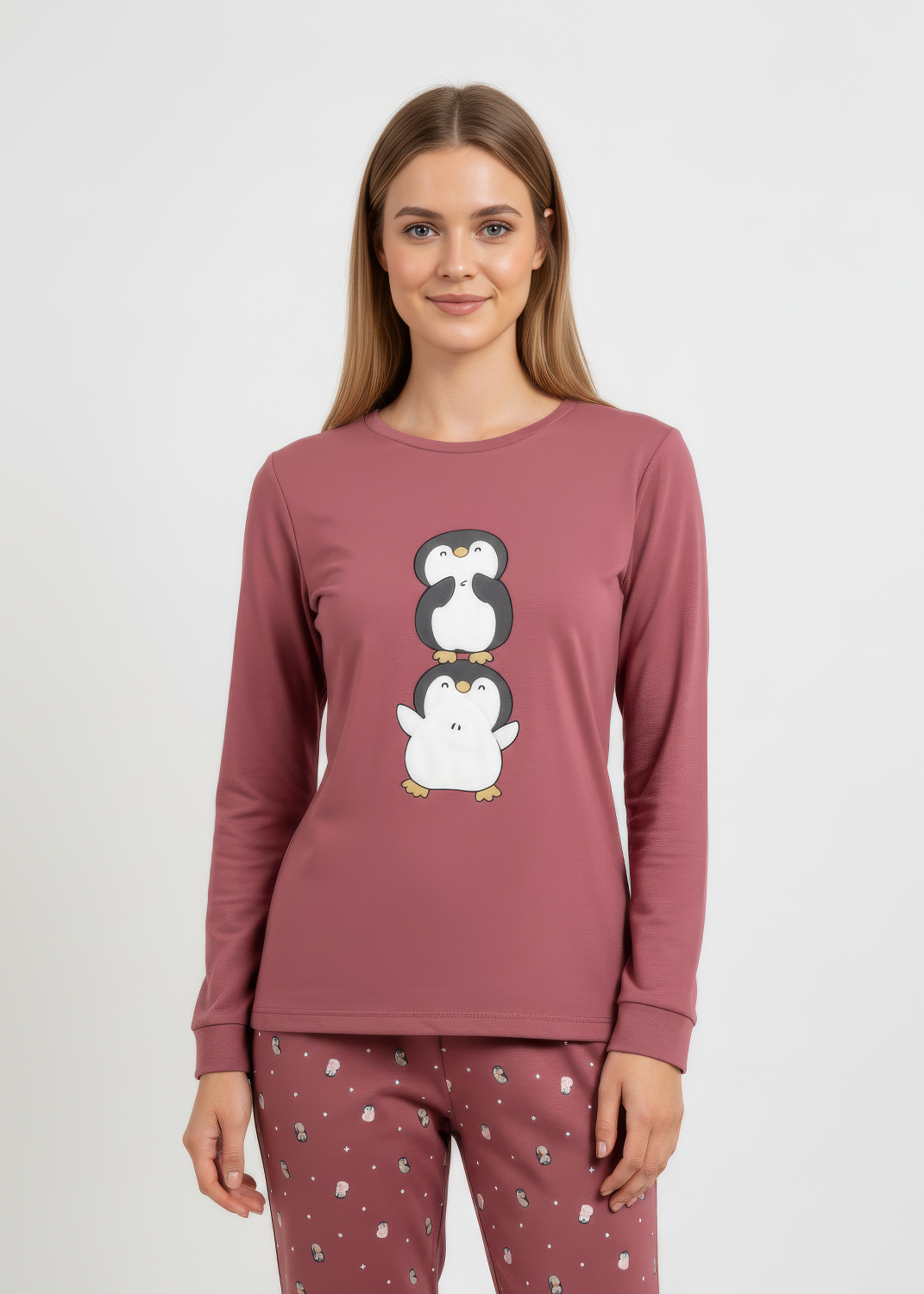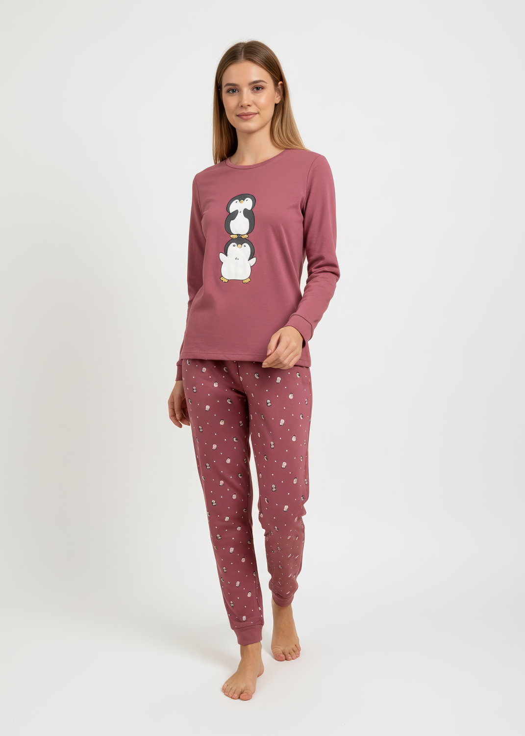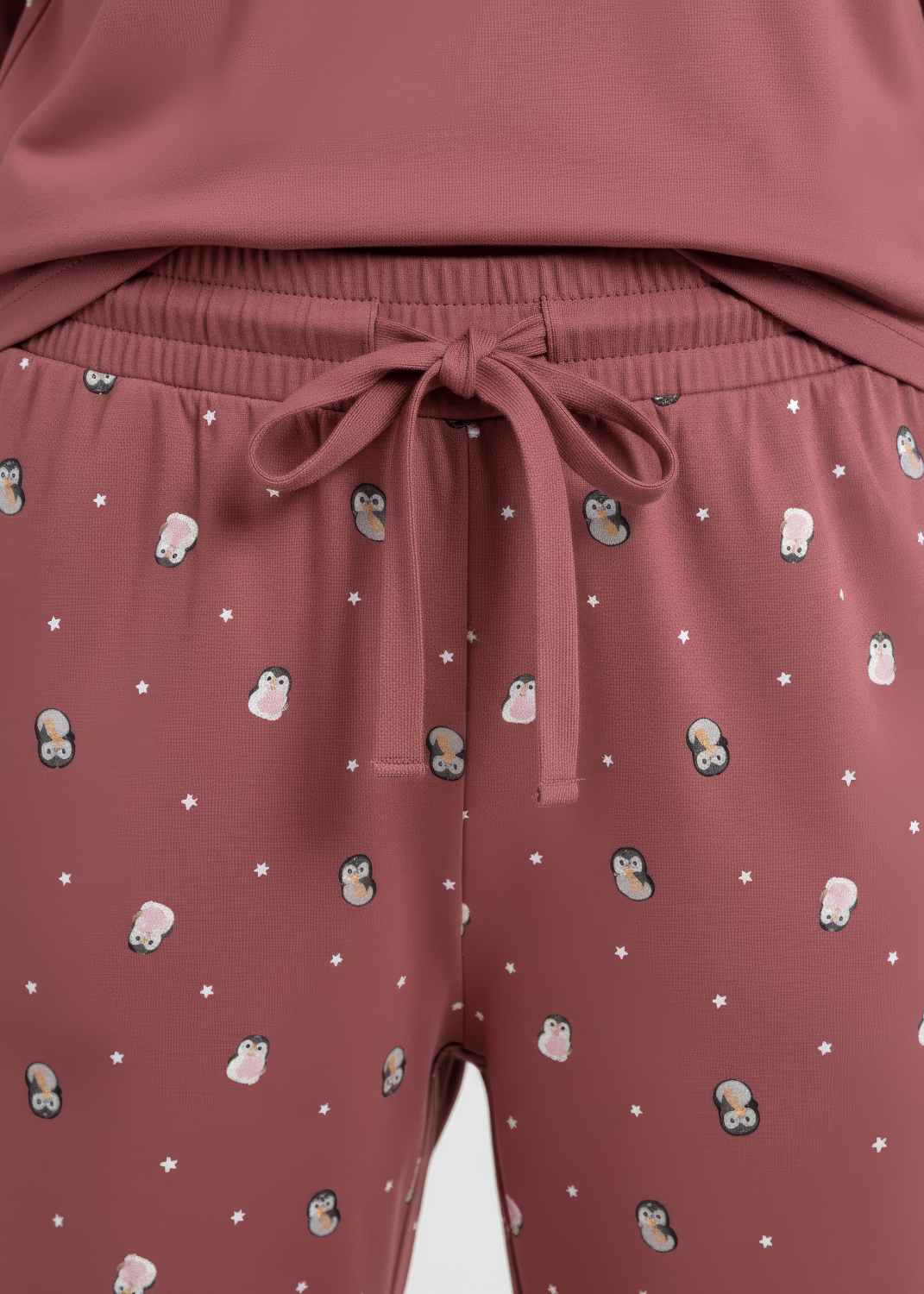 Pijama largo en tono liso con tela perchada que aporta suavidad y confort. La camiseta luce un encantador diseño de dos pingüinos, mientras que las mangas y el dobladillo del pantalón se ajustan perfectamente al cuerpo. El pantalón incluye un lazo en la cintura para un ajuste personalizado, además de un divertido estampado de pingüinos que aporta un toque alegre.