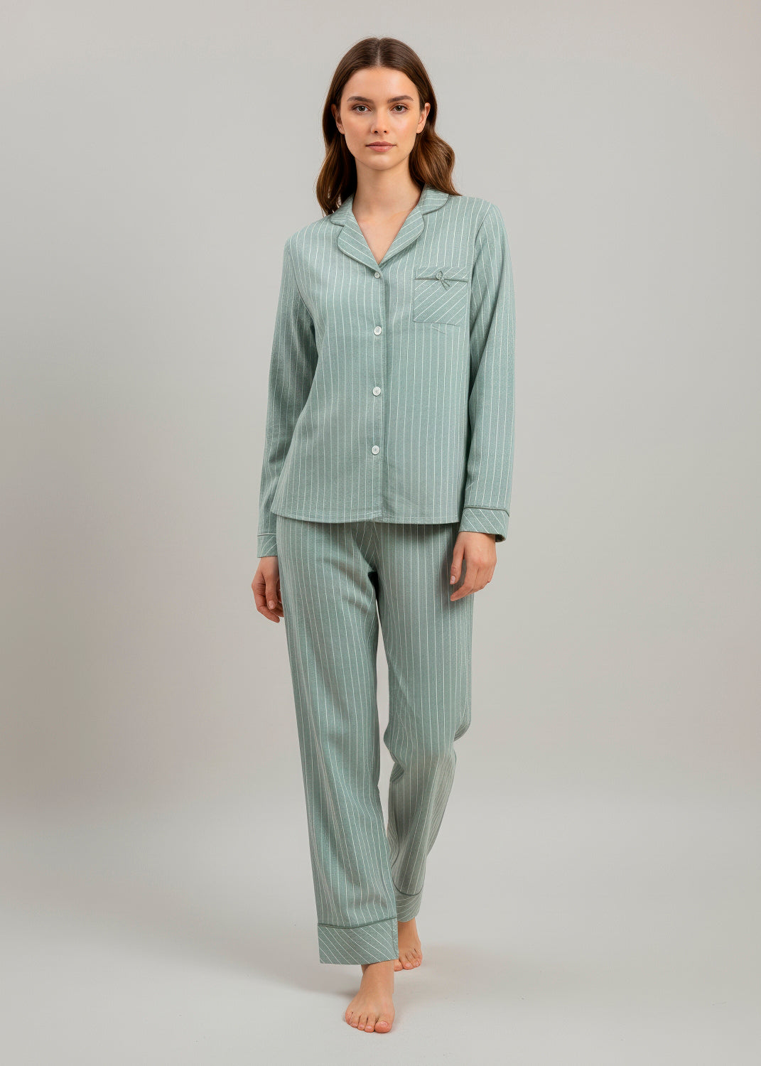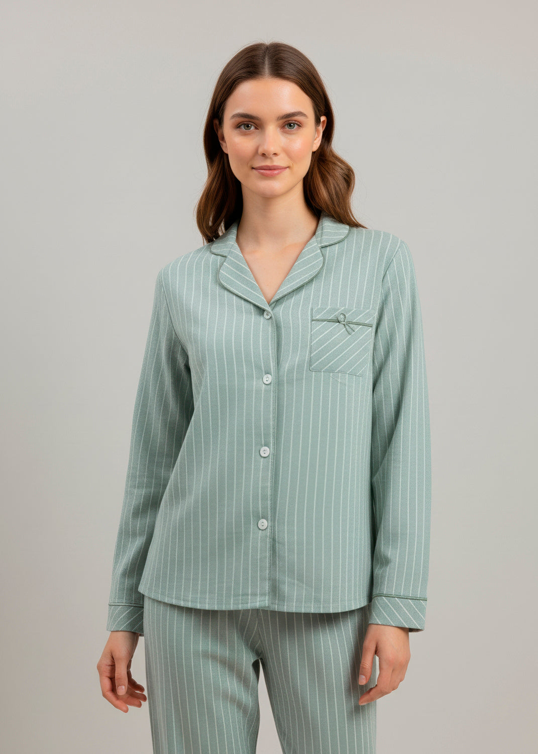 Este pijama largo perchado en color aguamarina presenta un diseño de rayas claras. La camisa incluye un bolsillo adornado con un lazo, mientras que las mangas y el dobladillo del pantalón cuentan con un acabado doblado que aporta un toque elegante y cómodo. Ideal para disfrutar de un descanso con estilo.