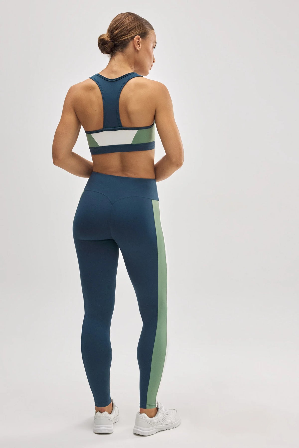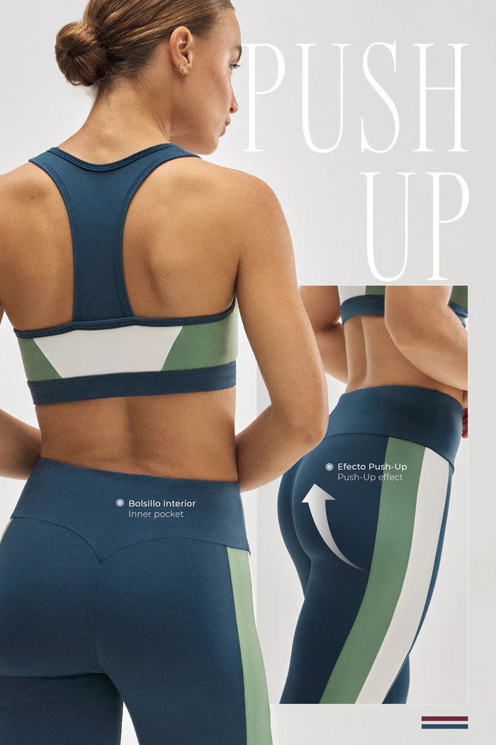 Con un estilo moderno y funcional, estos leggings deportivos tricolor en azul, verde y blanco combinan diseño y rendimiento. Su franja lateral en contraste destaca tu figura con un toque vibrante, mientras que el tejido elástico ofrece un ajuste cómodo y libertad total de movimiento. El efecto push-up realza tus glúteos de forma natural, y el bolsillo trasero interior te permite llevar tus objetos esenciales durante el entrenamiento. Perfectos para cualquier actividad deportiva o para lucir un look athleisure lleno de estilo.